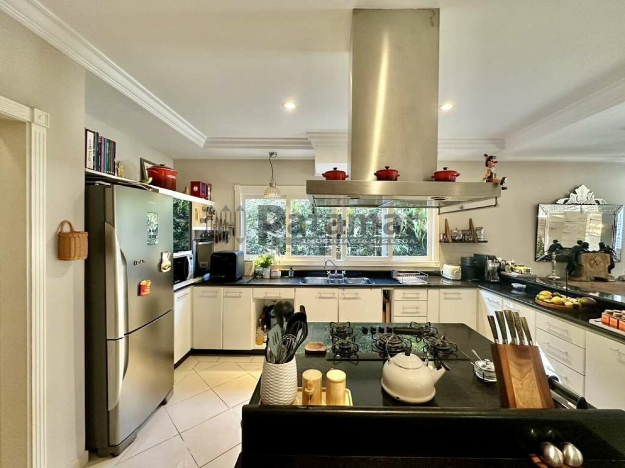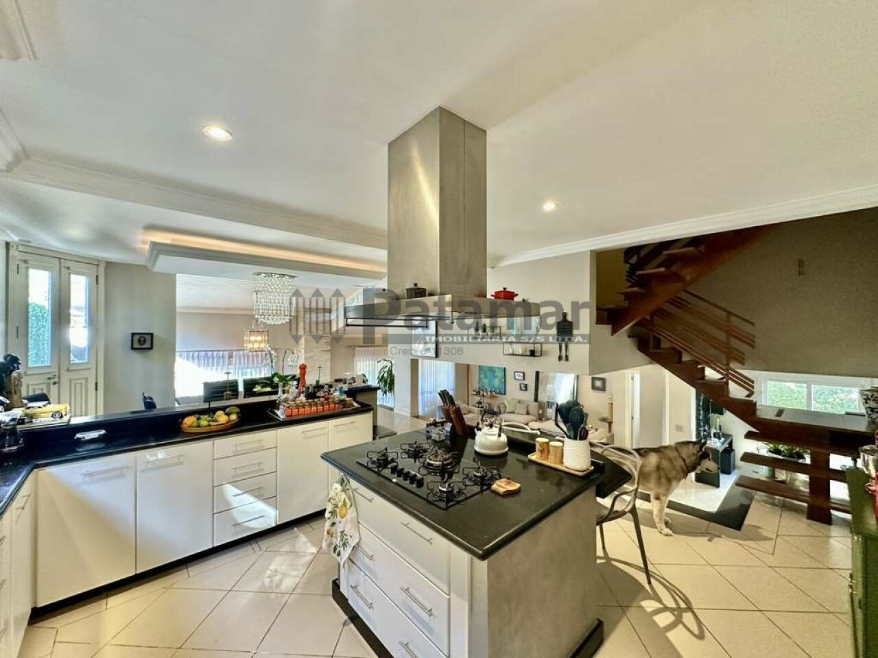 Copa cozinha integrada à sala de jantar, toda planejada com ilha, bancada de granito em ?L?, 2 cubas em inox, gabinetes, balcão e despensa. Fogão Cooktop 5 bocas, coifa, micro e forno.