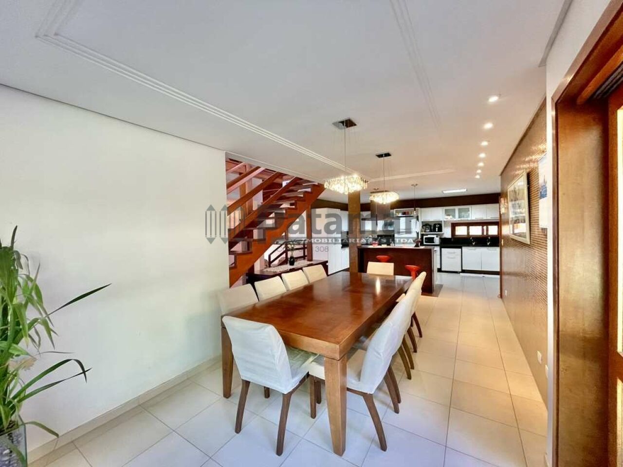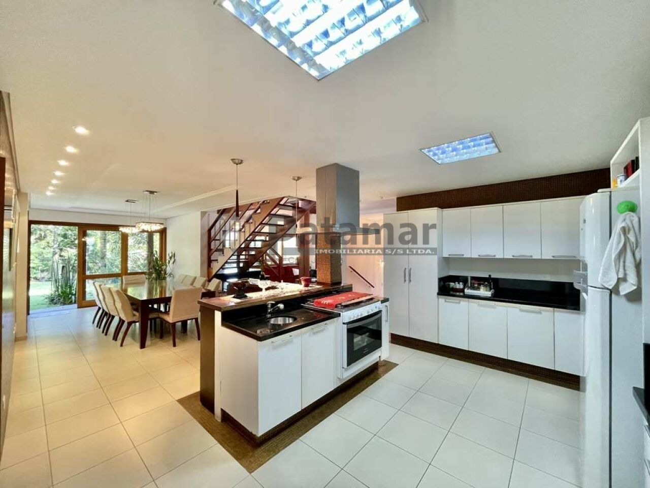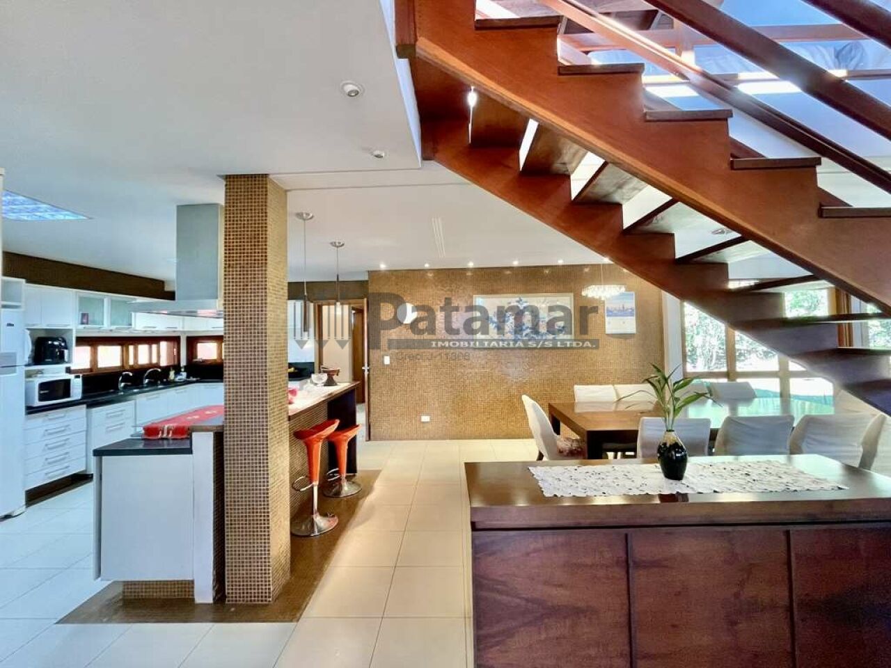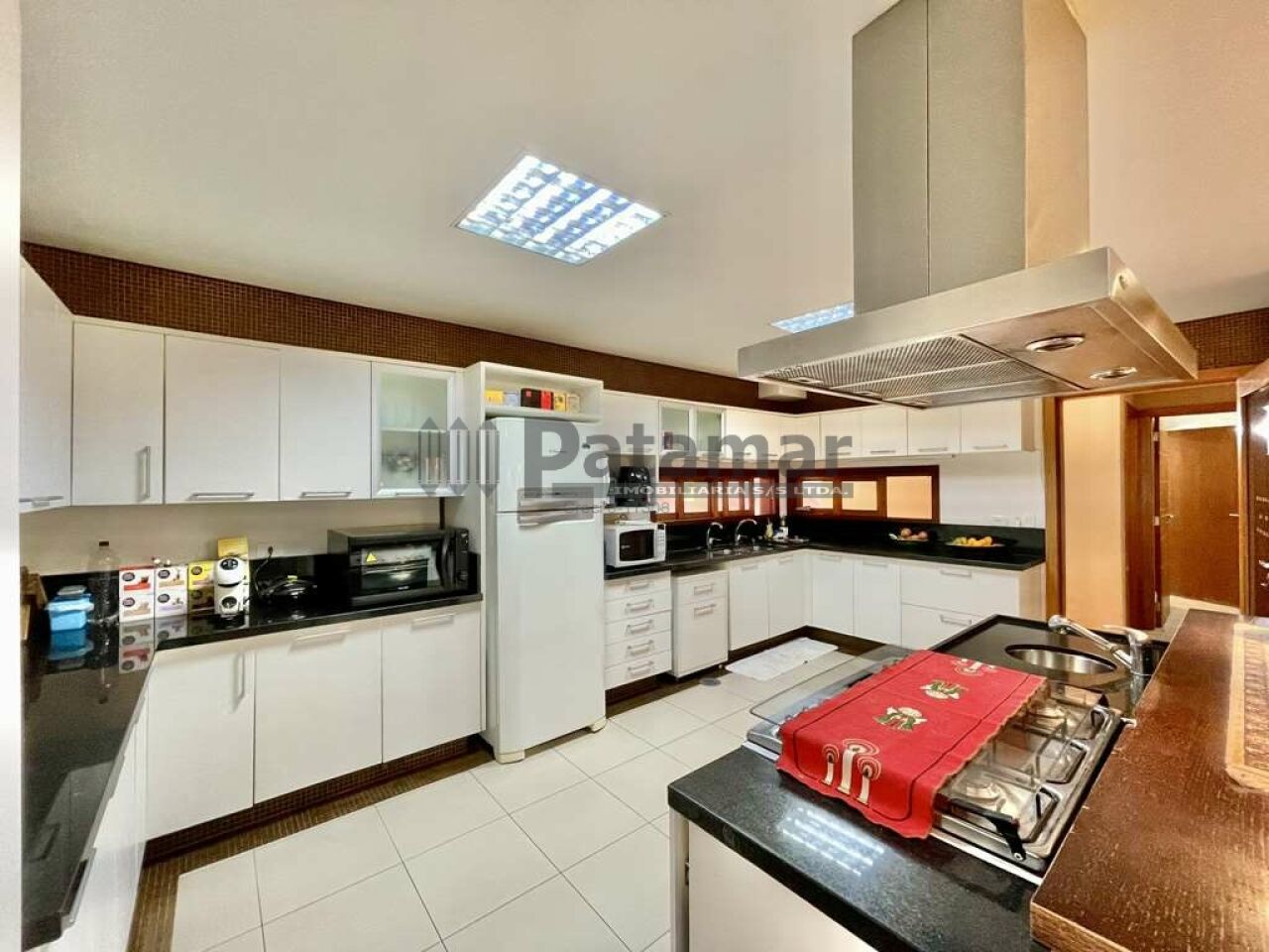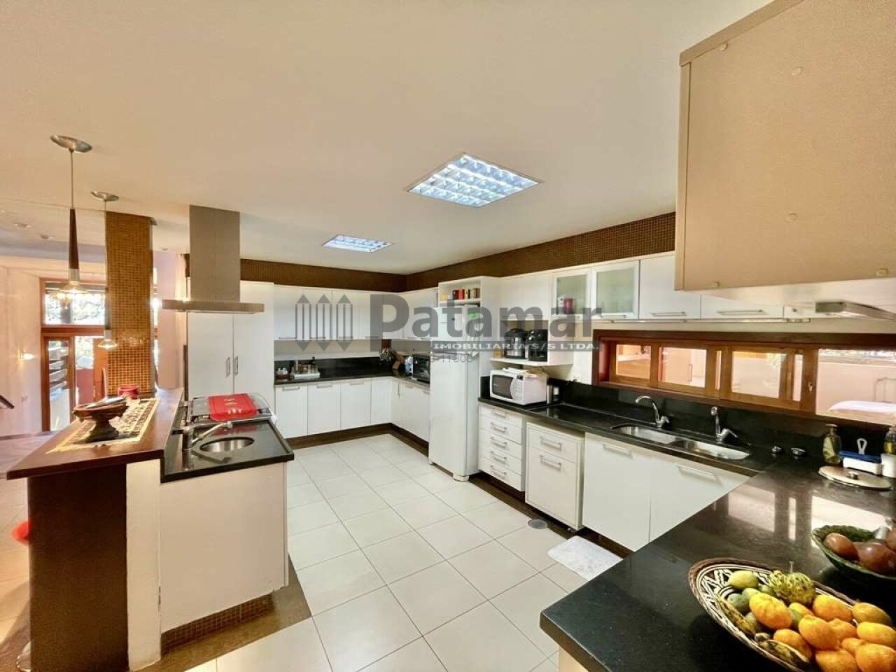 Cozinha planejada repleta de armários e gabinetes, integrada à sala de jantar, com bancada em ?U?, 2 cubas Inox, ilha com balcão e coifa inox.