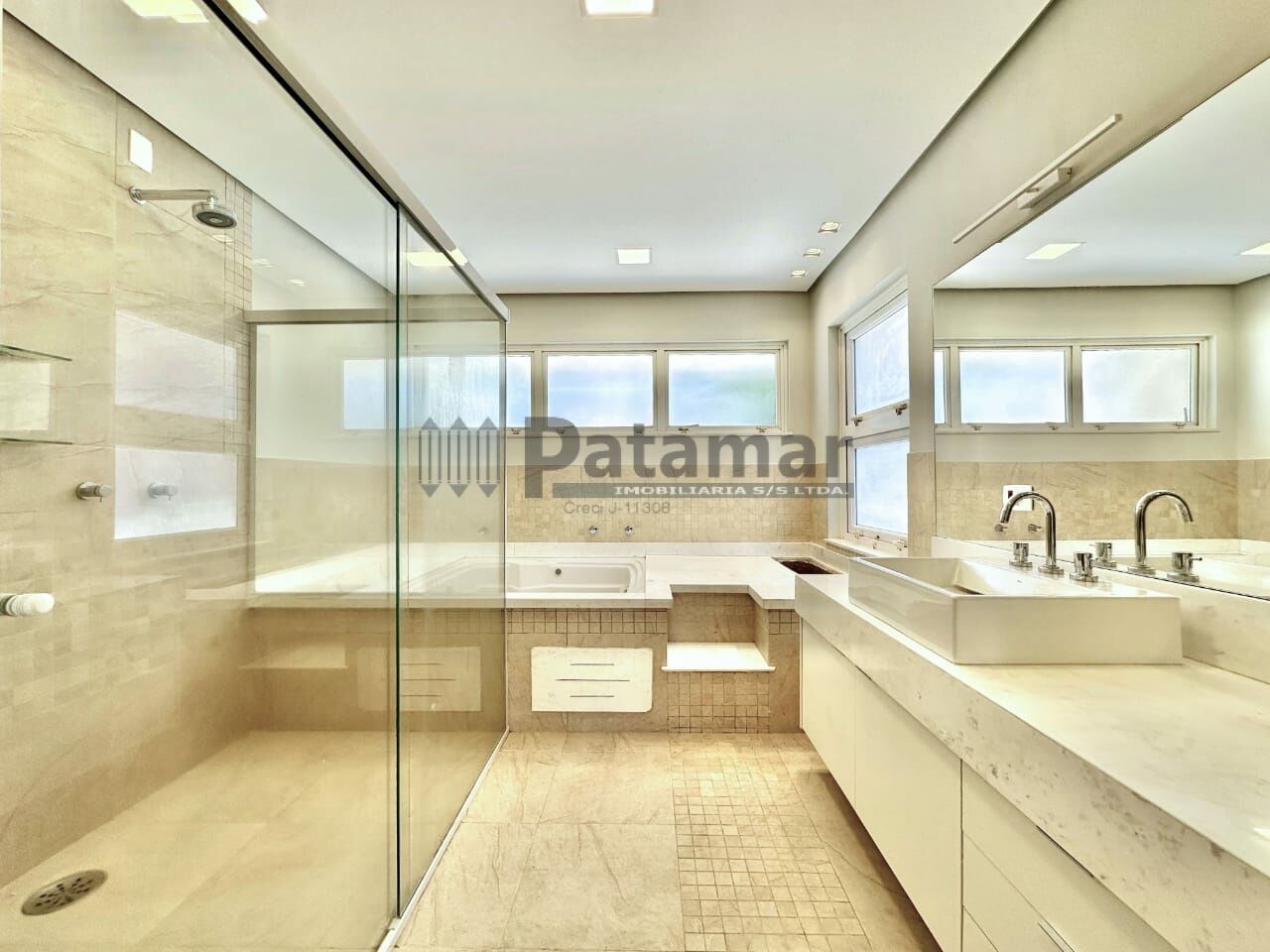 Suíte master com ar-condicionado Q e F, saleta para TV com lareira em travertino preparada para gás, janela panorâmica, espaço para cama King Size, penteadeira, gaveteiros, criado mudos, Closet amplo para sr e sra com espelhos, porta de correr, nichos, sapateiras e armários. Banheiro com bancada de mármore branco com 2 cubas, 2 duchas, banheira hidromassagem dupla, vaso sanitário isolado e porta de vidro