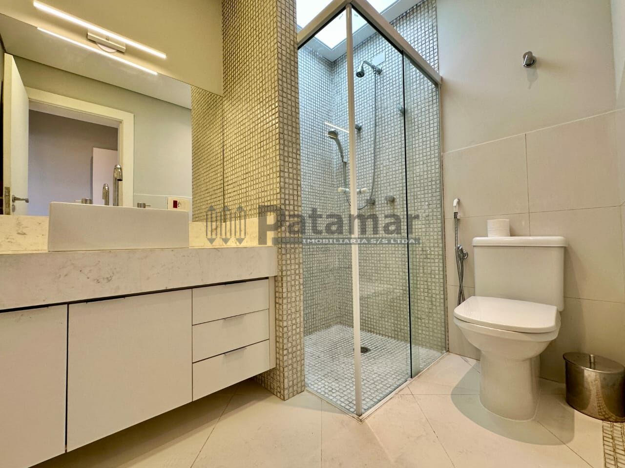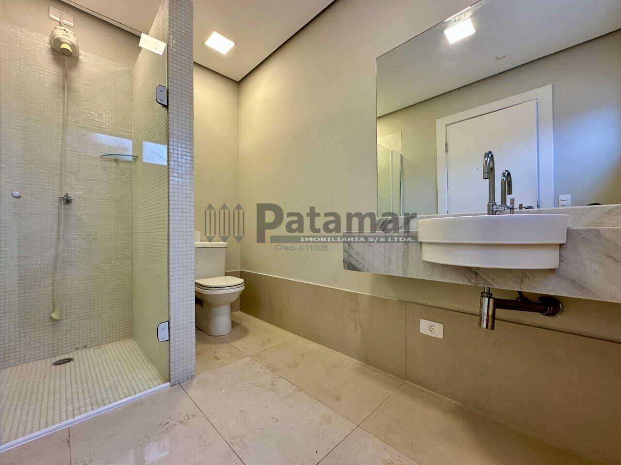 Vestiário com tampo em mármore, chuveiro elétrico e box de vidro.