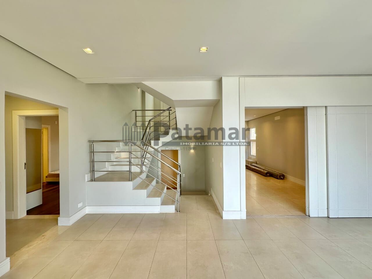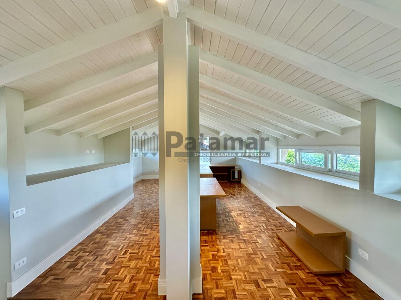 Sótão com espaço multiuso de aproximadamente 68 m² c/ vista panorâmica, bastante iluminado e arejado. Piso de madeira, possui um lavabo e depósito técnico de serviço. Ideal para home office, estúdio, atelier, TV, jogos, música, brinquedoteca, academia e até dormitórios adicionais. O acesso é pelo hall intimo por escada de estrutura de ferro, revestida em madeira, com guarda corpo de metal