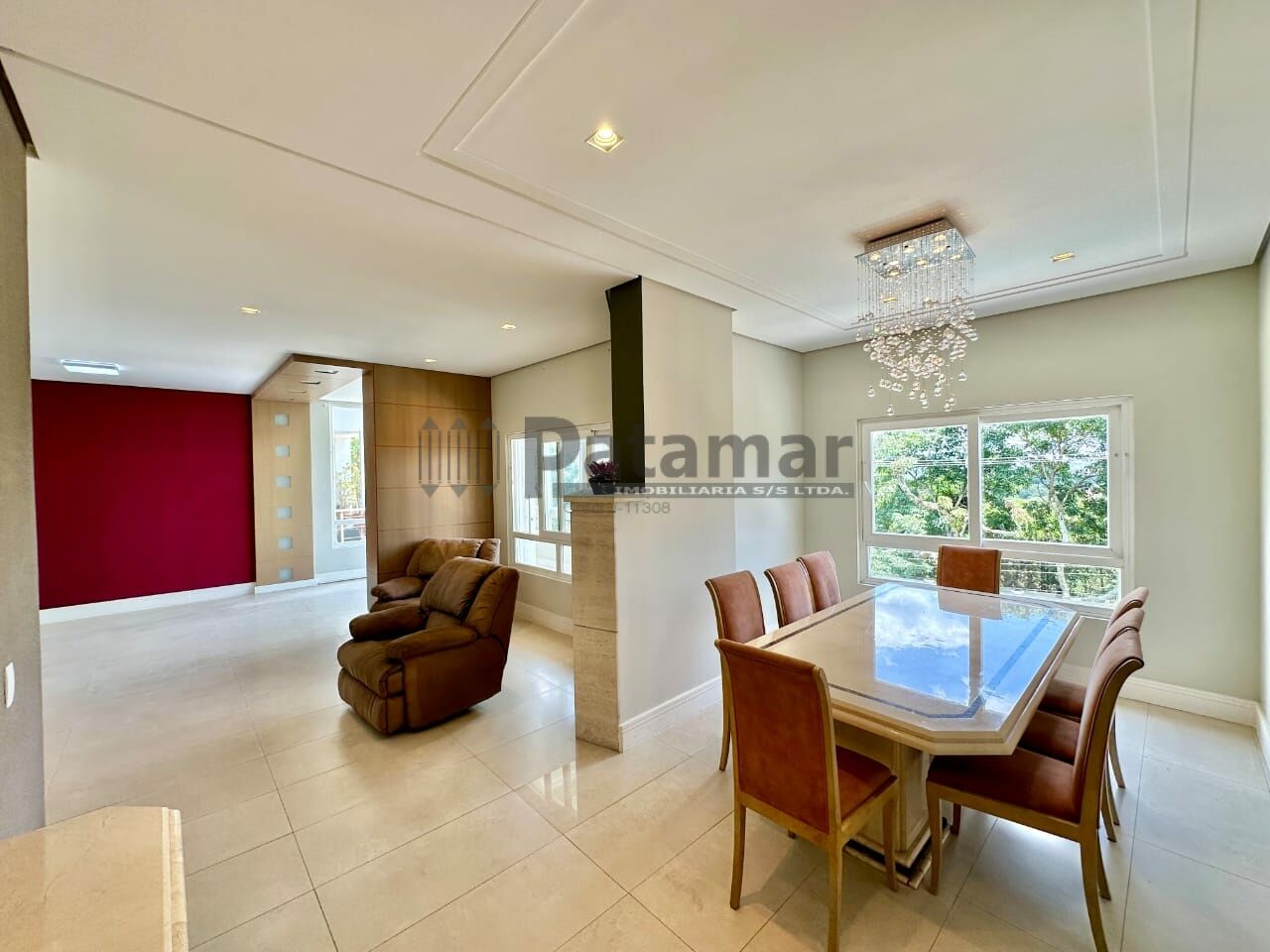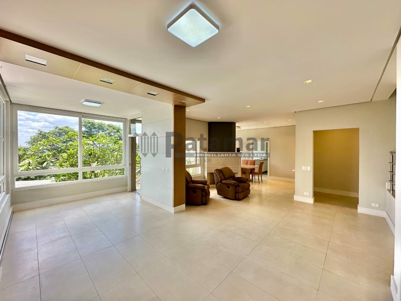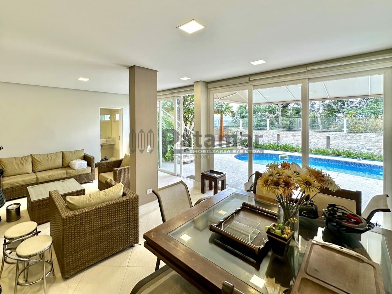 Living amplo para 5 ambientes integrados, voltados para varanda com vista para o Vale da Fazendinha e piscina. Sala de jantar, sala de estar com lareira em travertino, sala de leitura, home theater /family room reservado, com porta de correr e vista para jardim de inverno.