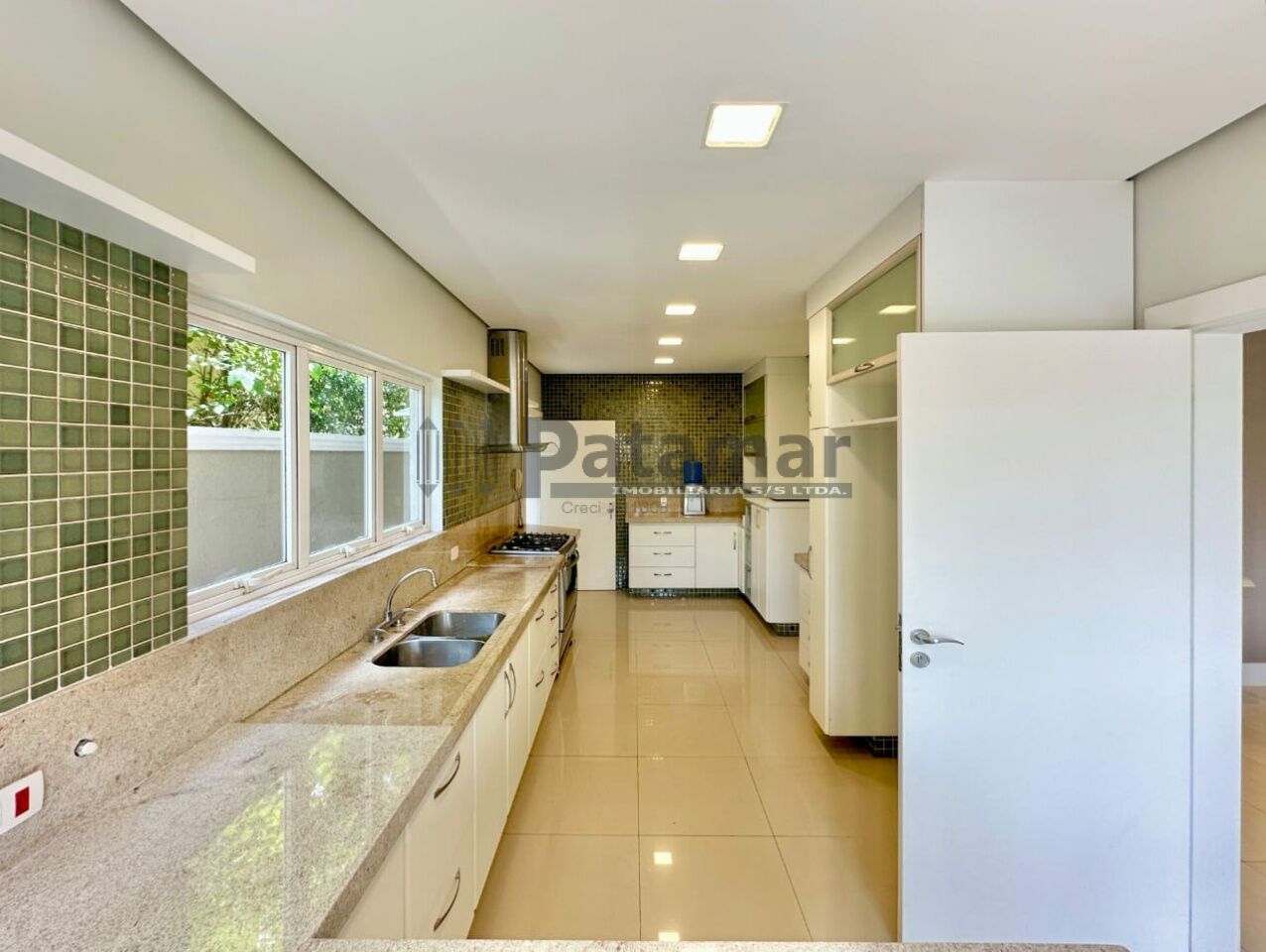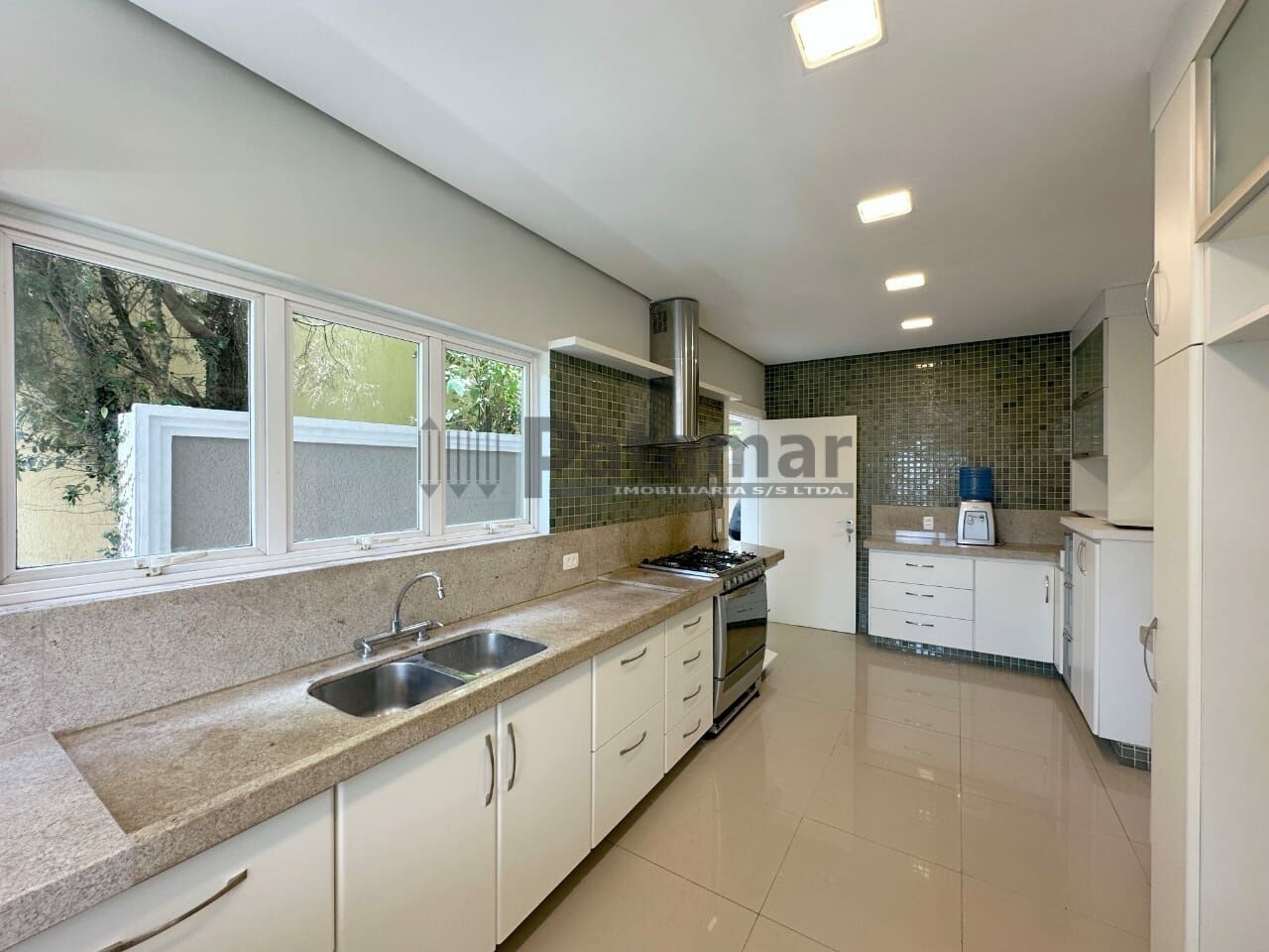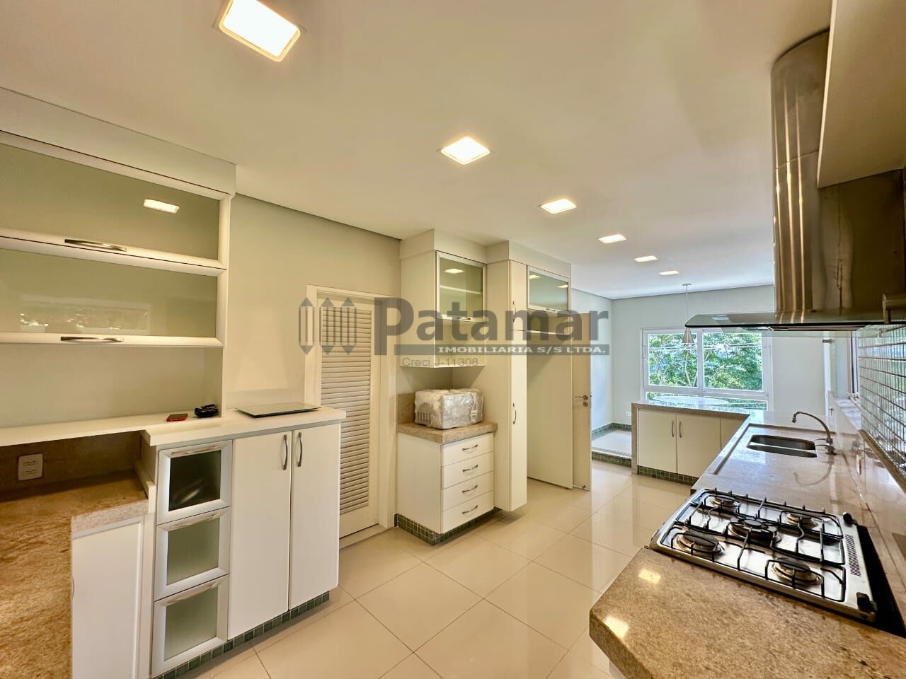 Copa cozinha ampla, repleta de armarios planejados integrada à sala de jantar, sala de almoço e café da manhã com vista panorâmica. Bancadas e balcão em granito, com pia dupla inox, coifa, espaço para fogão de 6 bocas, geladeira duplex e despensa com prateleiras em granito