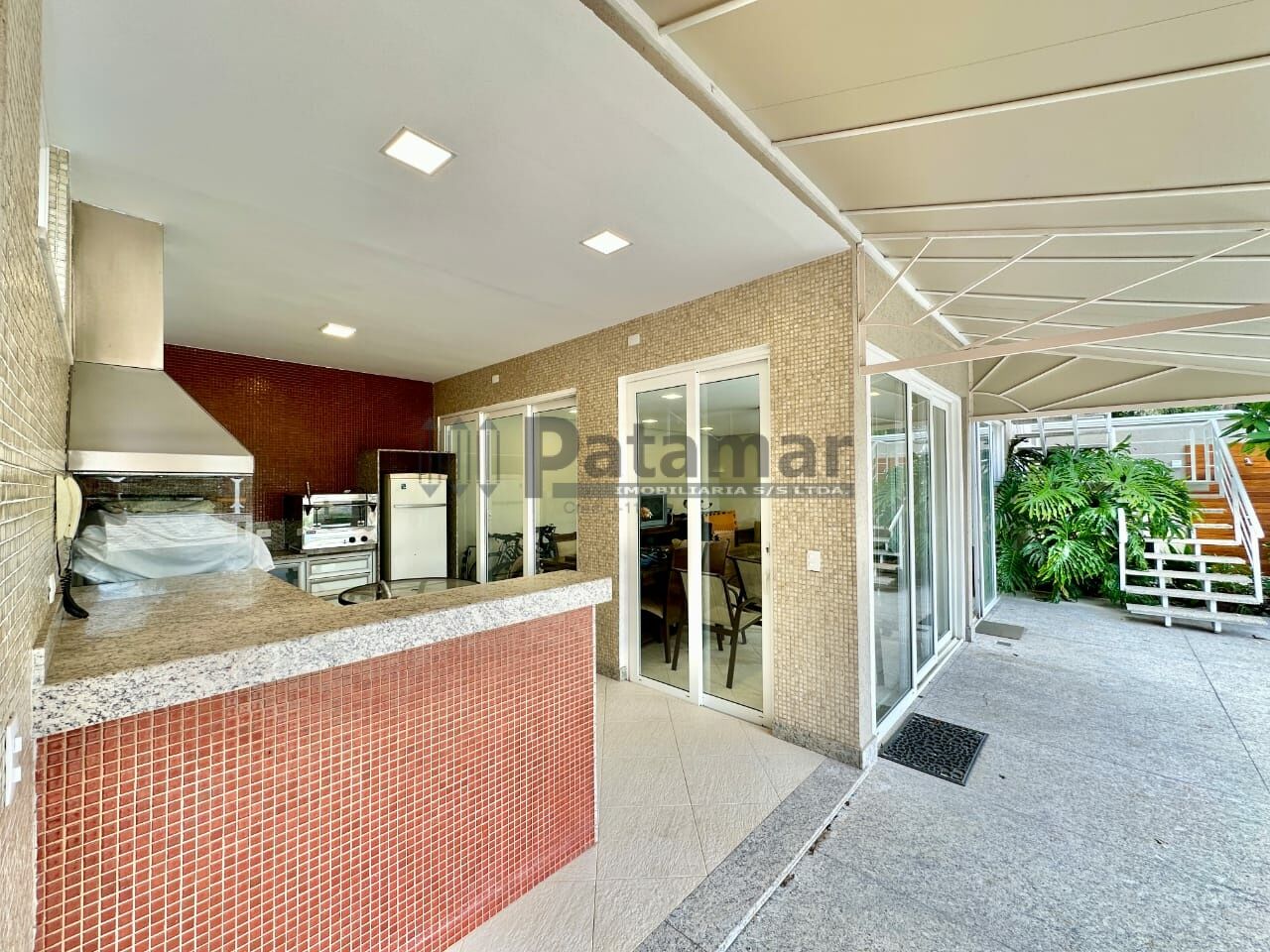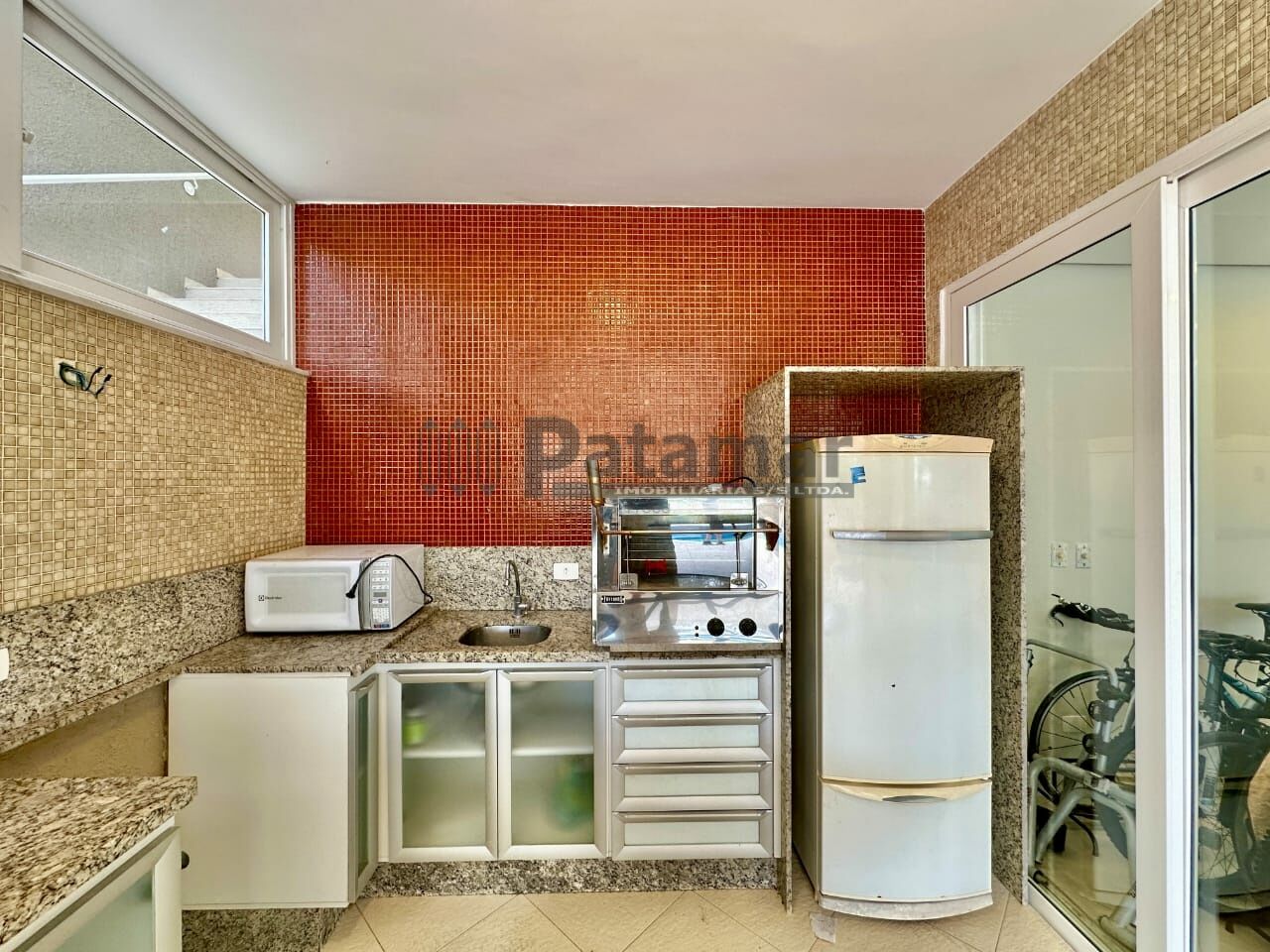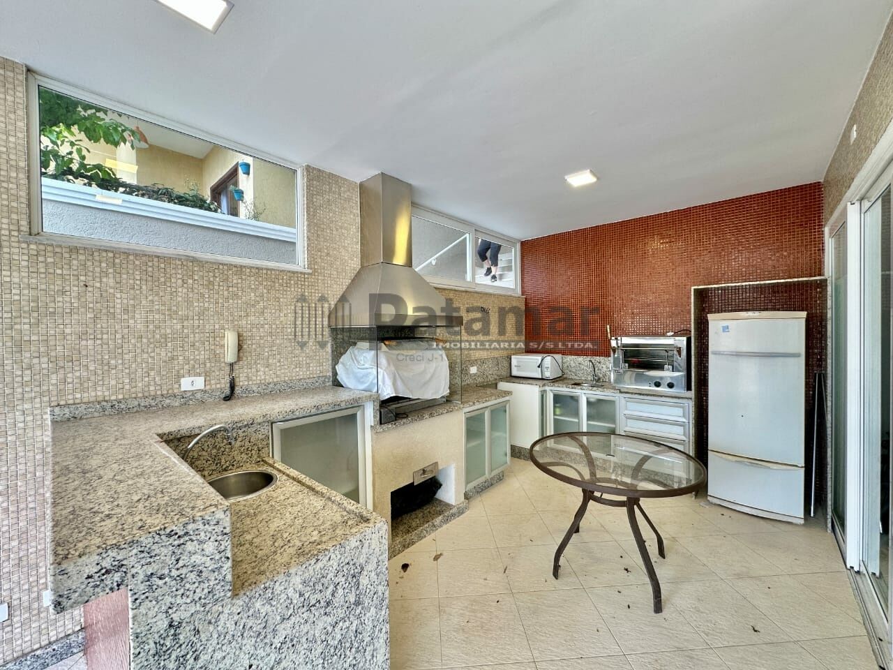 Salão de Festas amplo Gourmet envidraçado e PVC com toldo, churrasqueira, forno de pizza elétrico, coifa, armários e gabinetes, bancadas e balcão em granito, cuba inox com 2 torneiras, espaço para fogão, geladeira e micro-ondas.