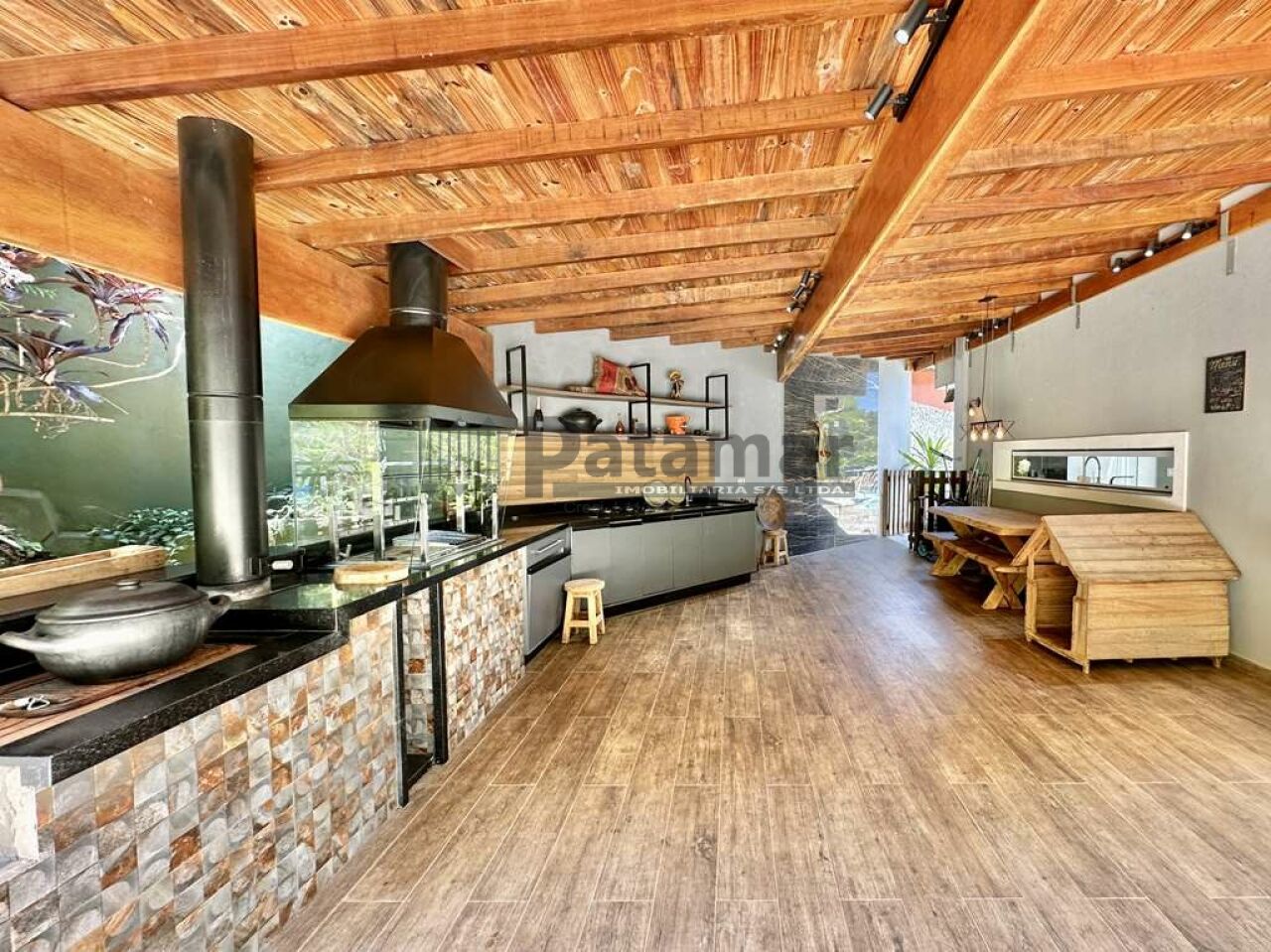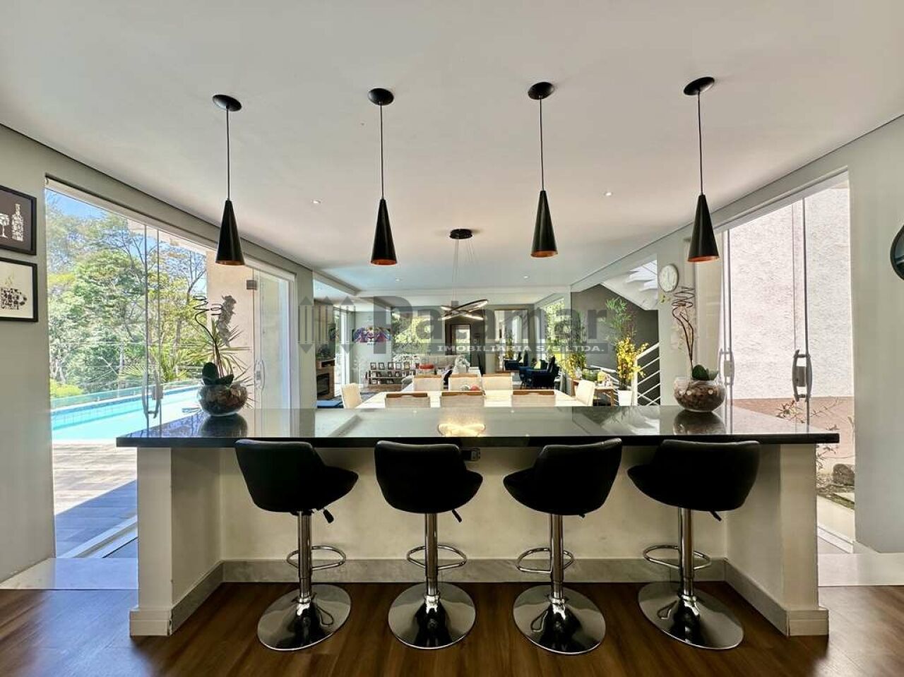 Varanda gourmet para 3 ambientes integrados à piscina e um grande pátio, com churrasqueira de vidro, coifa, tampo em granito, cuba inox, forno e fogão à lenha e fogão cook top Electrolux 4 bocas.