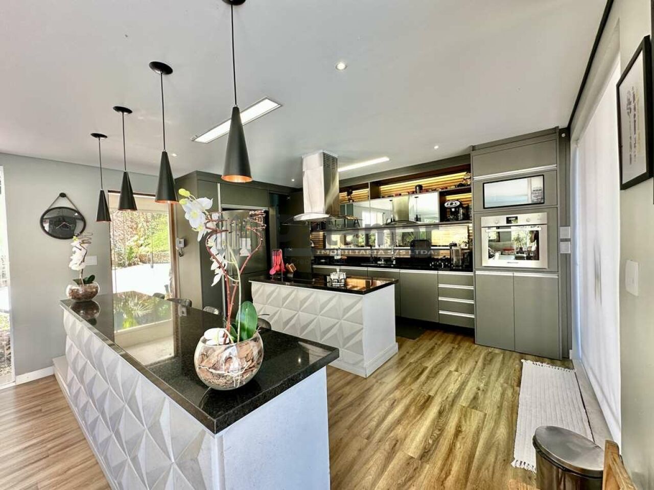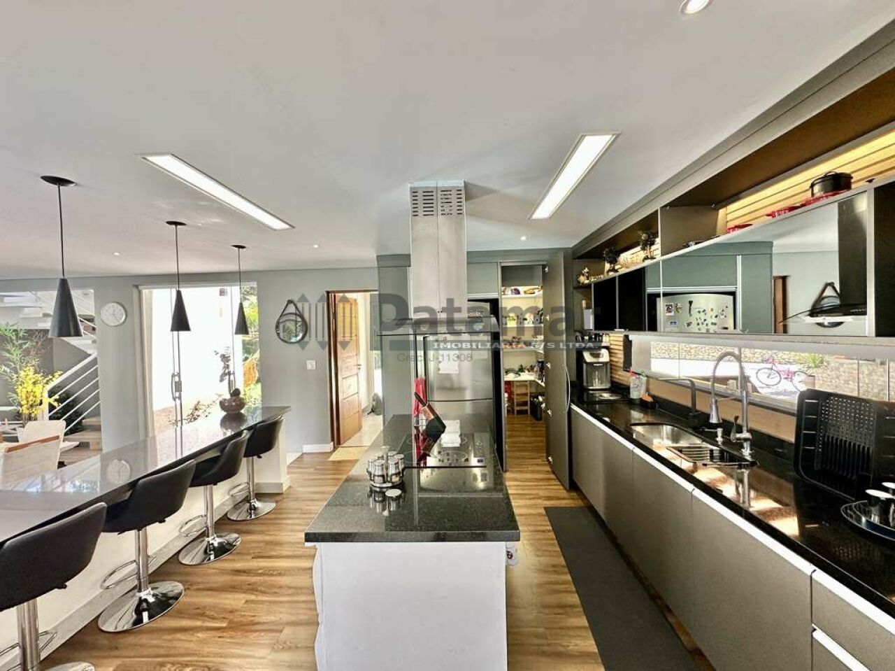 Cozinha integrada ao living, planejada repleta de armários e gabinetes, balcão para 5 lugares, ilha com fogão por indução Idea, coifa inox, micro-ondas, forno elétrico ative Brastemp, micro-ondas ative, tampo em granito, 2 cubas inox, torneira gourmet e excelente despensa.