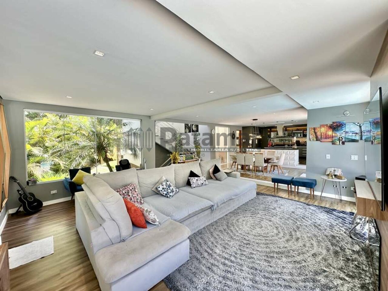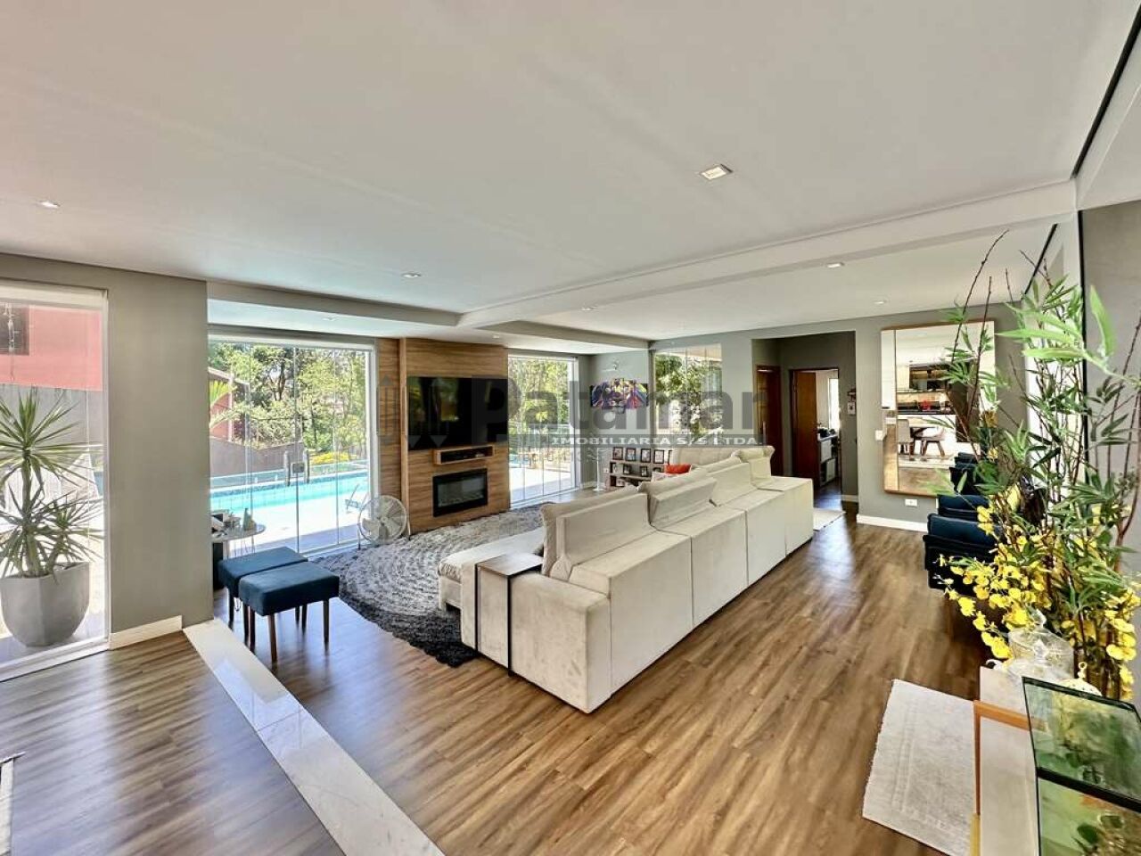 Living para 6 ambientes integrados voltados par o lazer, com varanda gourmet e piscina.