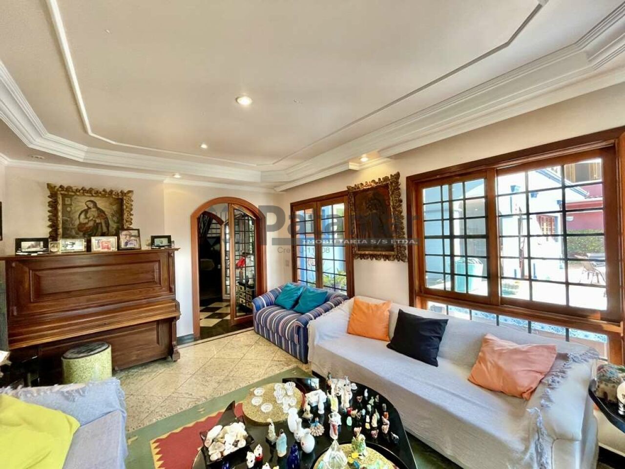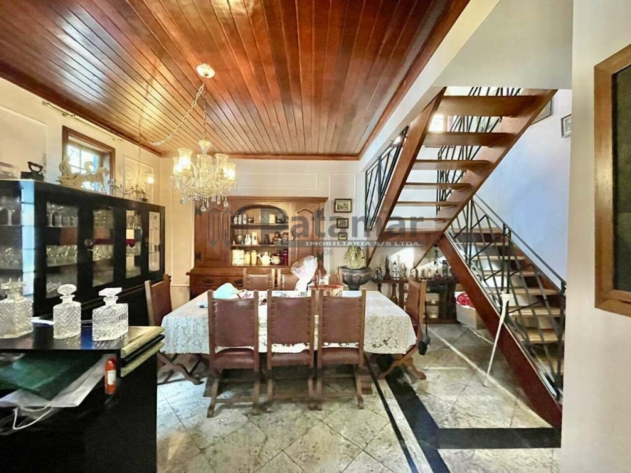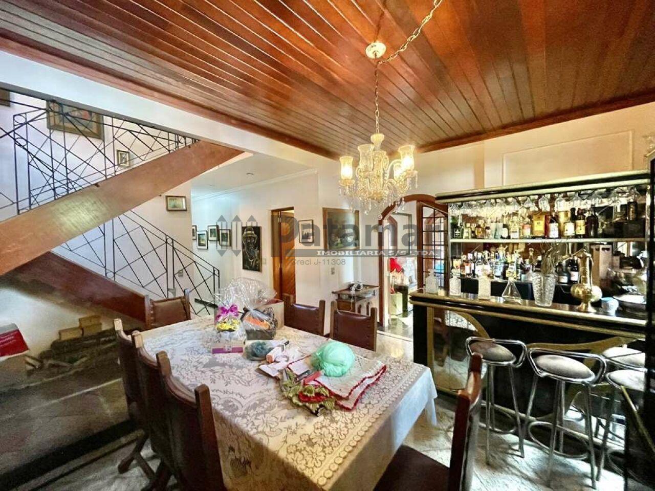 Estar, lareira em mármore, jantar e bar