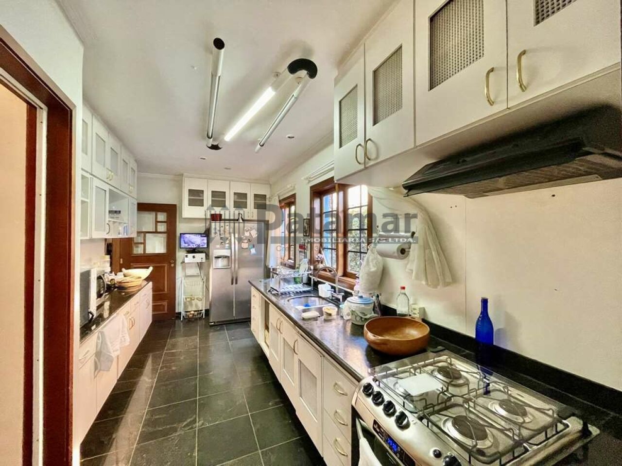 Cozinha planejada tampo em granito, 2 bancadas com cubas inox e despensa