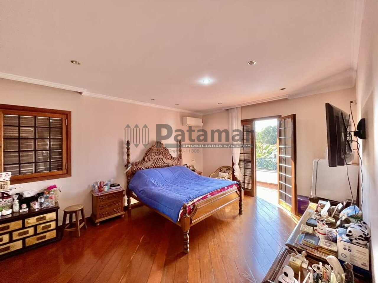 Portas e janelas em madeira e vidro, com telas contra insetos nos quartos