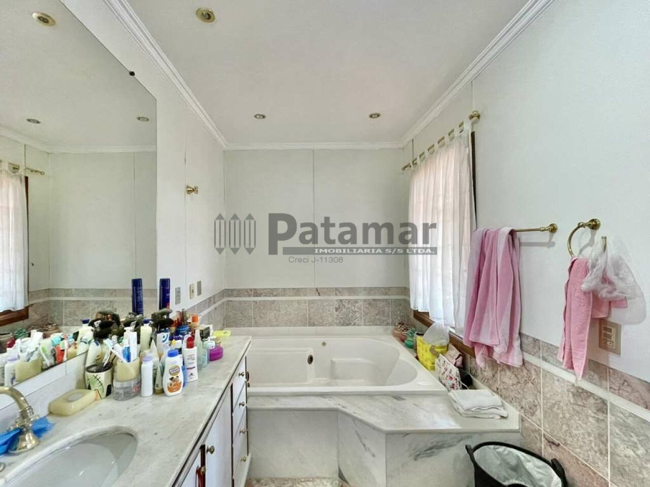 Banheiros com tampos em mármore, espelho e box de vidro, sendo a master com hidro dupla