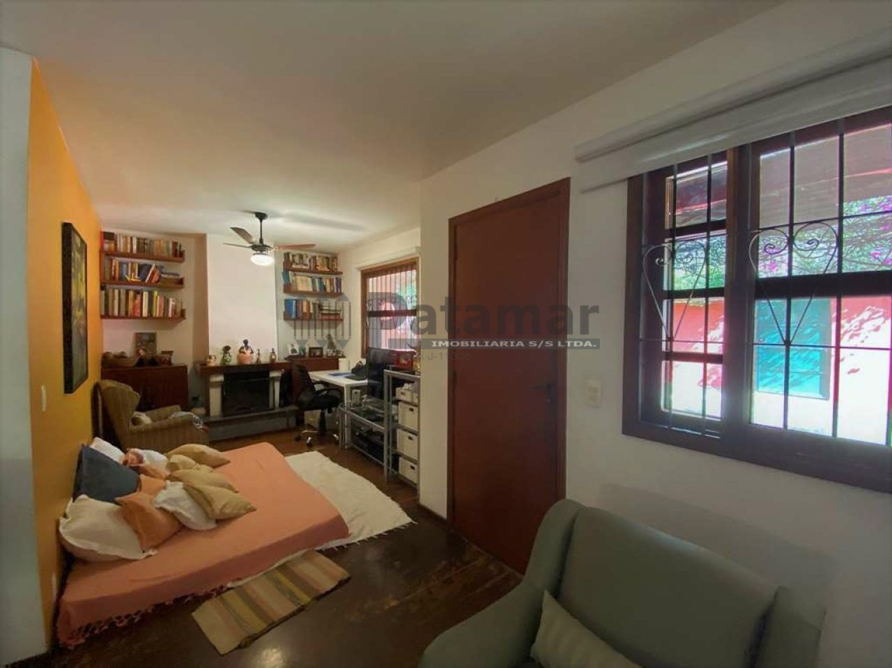 Salas de TV e escritório com lareira, estar e jantar.
