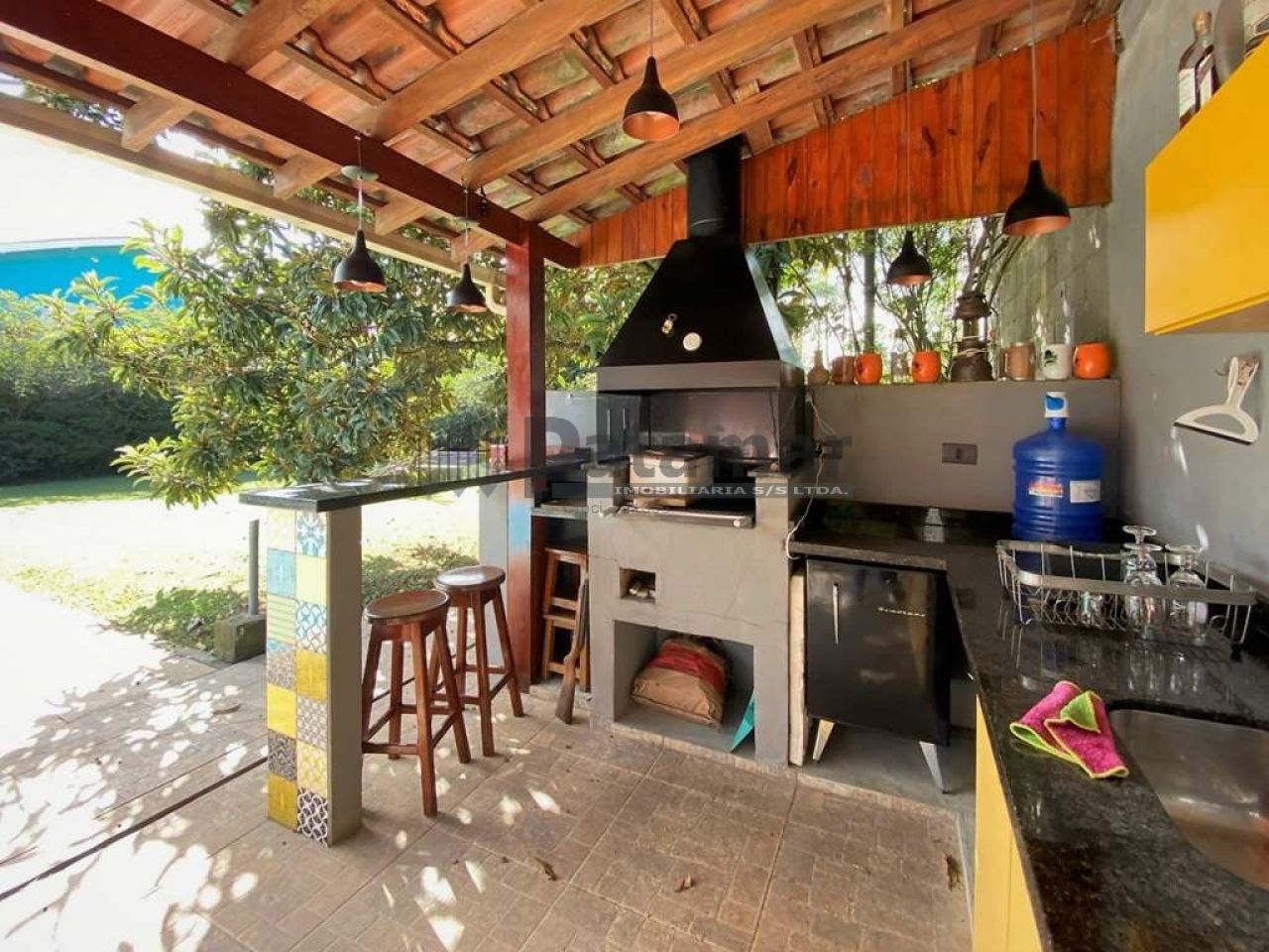 Anexo gourmet com churrasqueira, bancada, pia, gabinetes e balcão.