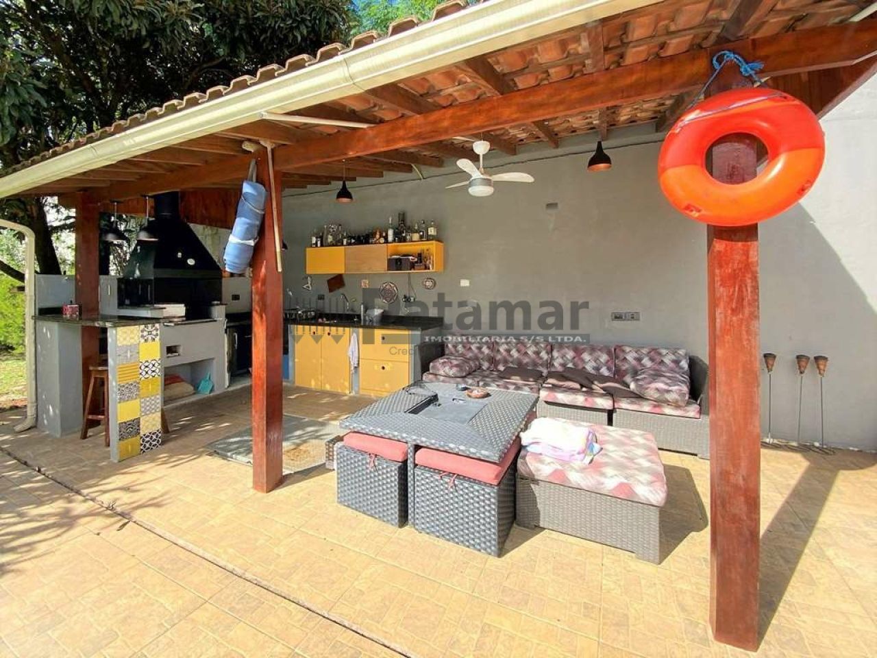 Lavanderia externa coberta e integrada à cozinha, com bancada e tanque.