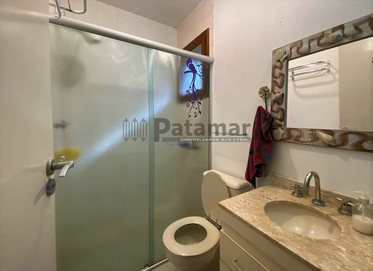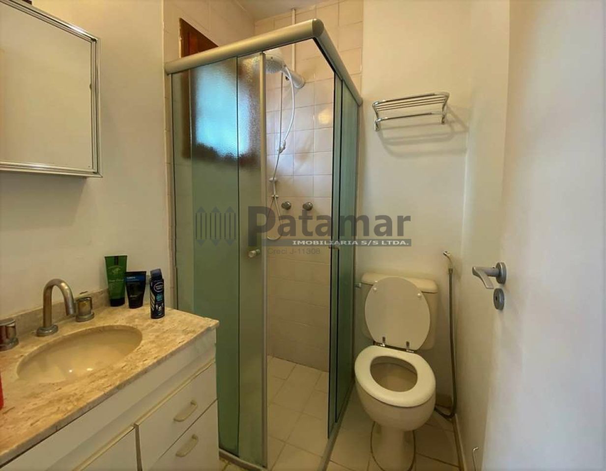 Banheiros com bancada, pia, espelho, gabinetes, bidê e box de vidro. Sendo a máster com tampo em mármore travertino.