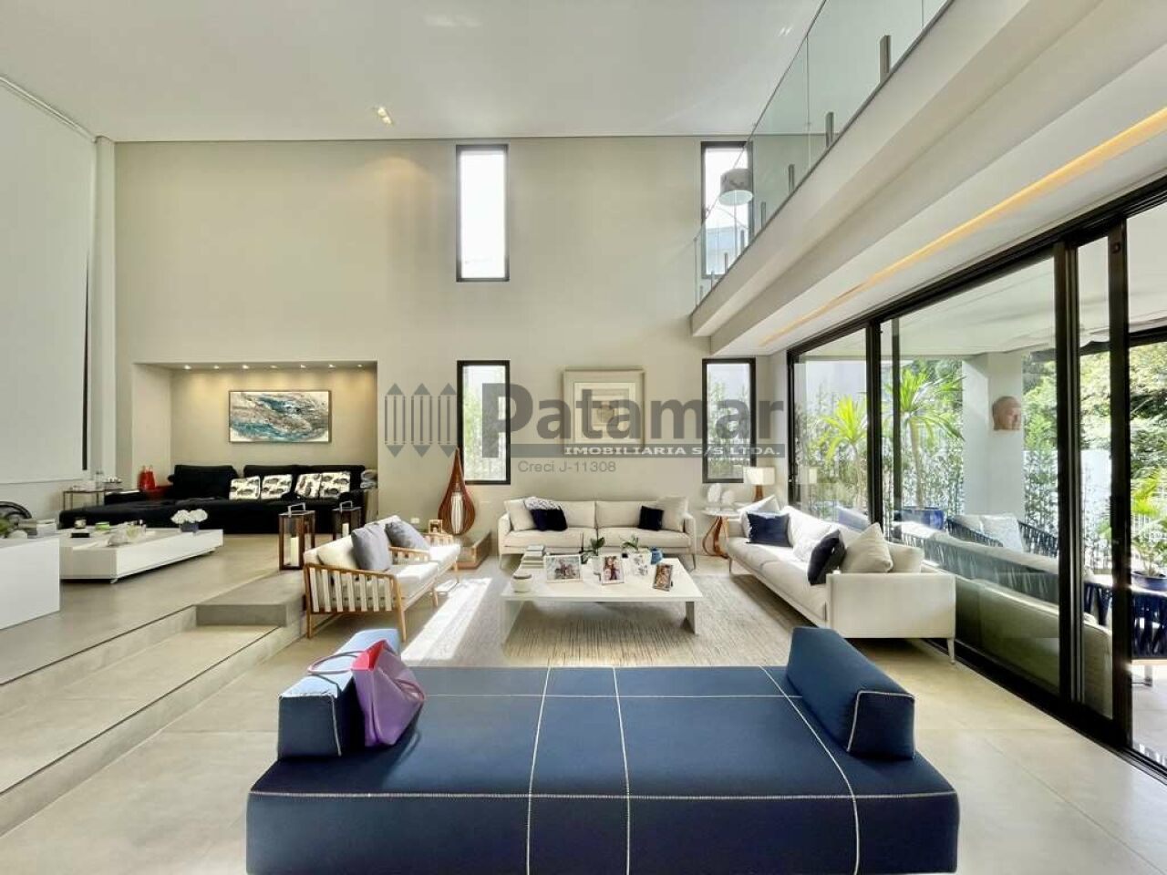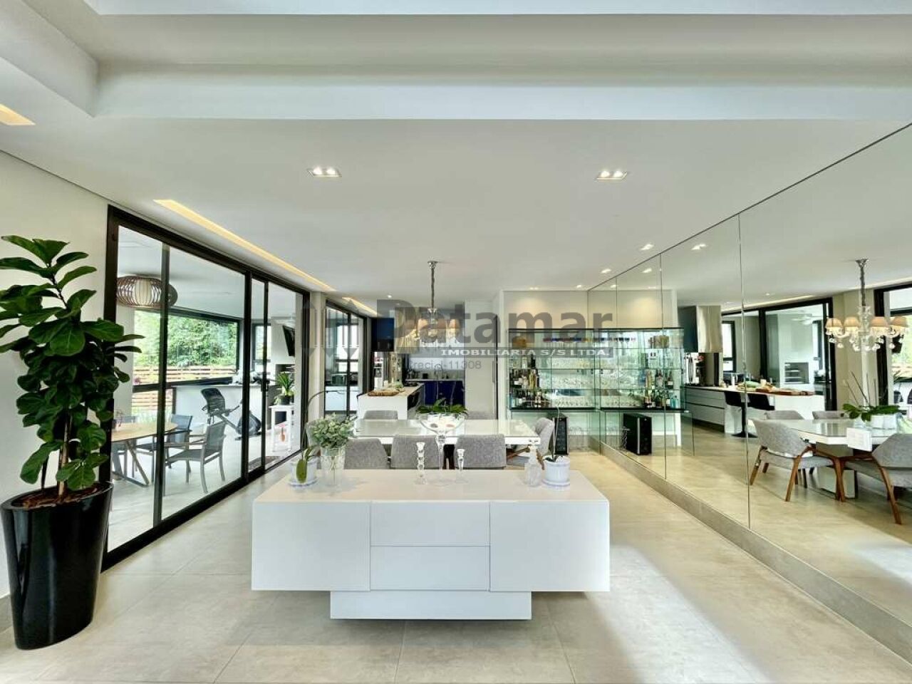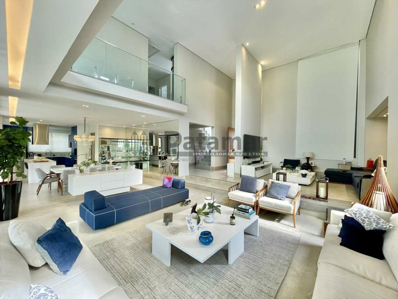 Living imponente com pé direito duplo e grandes espelhos para 6 ambientes integrados, voltados para varanda gourmet, quintal com piscina e jardim.