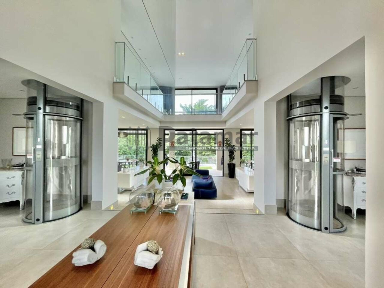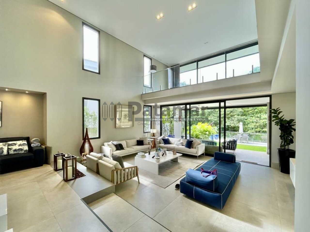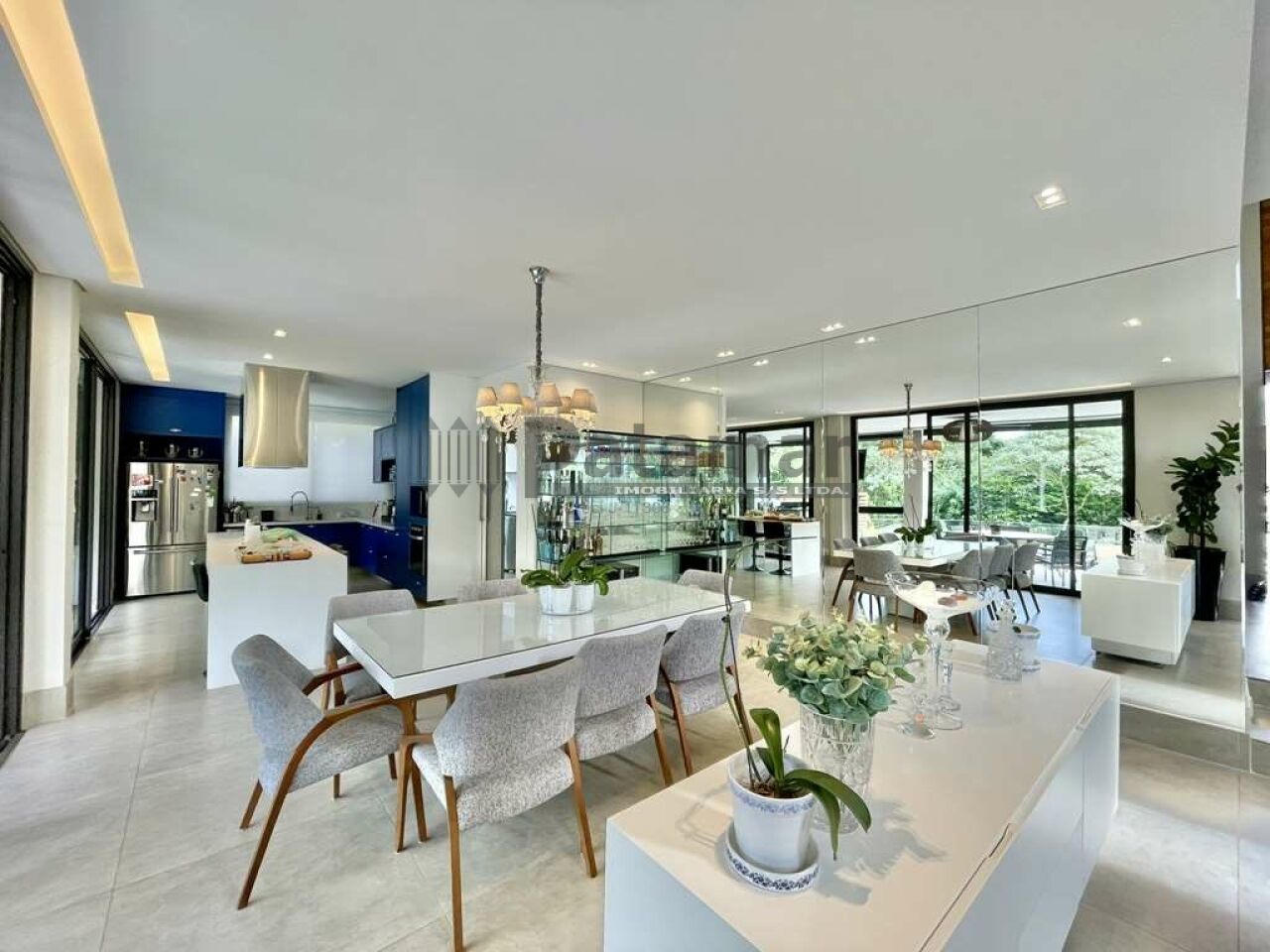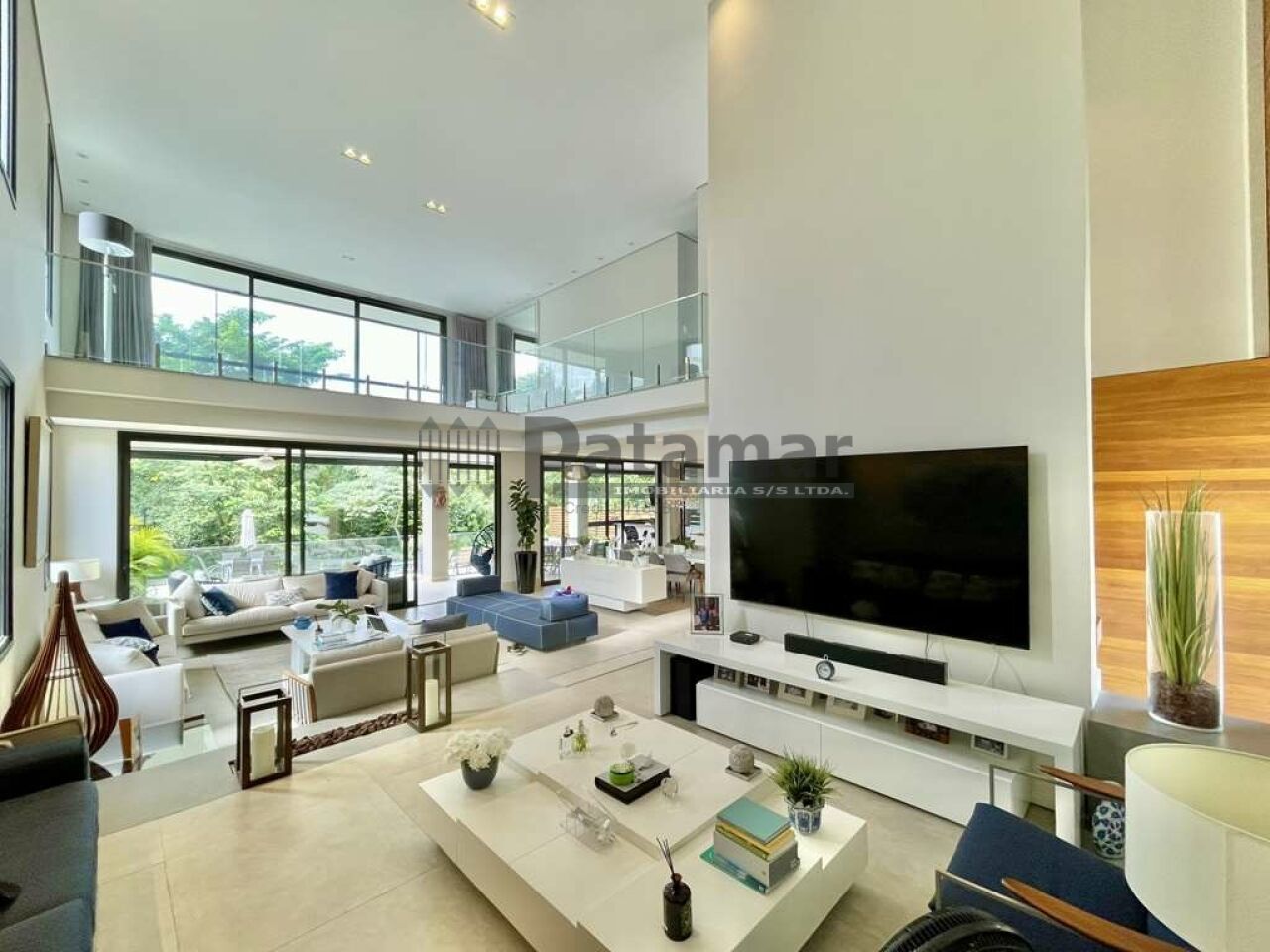 Living imponente com pé direito duplo e grandes espelhos para 6 ambientes integrados, voltados para varanda gourmet, quintal com piscina e jardim.