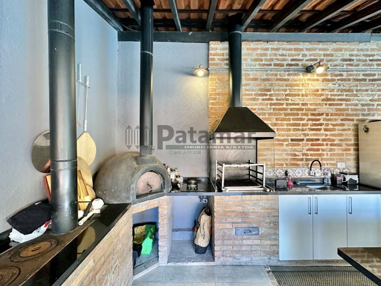 Anexo gourmet envidraçado (retrátil) para vários ambientes, com churrasqueira, forno de pizza, fogão à lenha e cooktop, com bancada, pia, gabinetes e balcão.