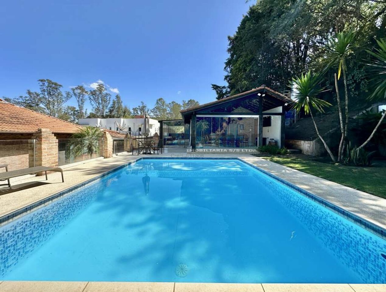 Piscina aquecida solar com guarda corpo de vidro e solarium.