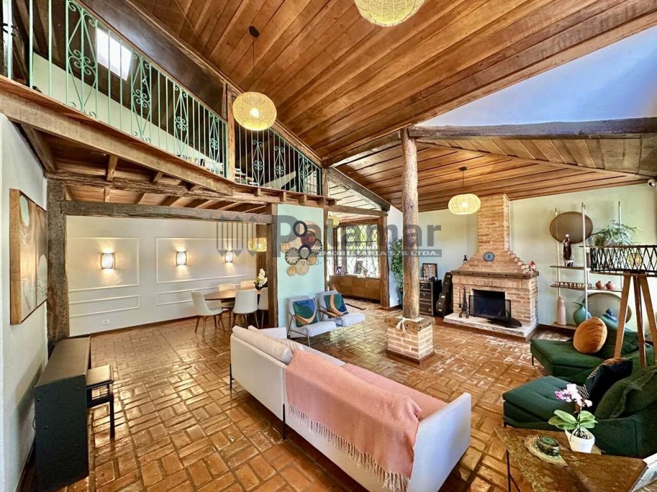 Sala estar, lareira, jantar e bar.
