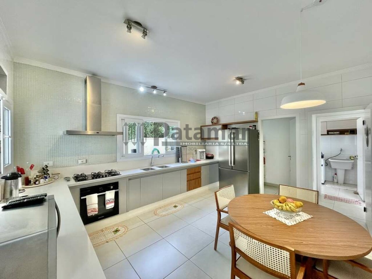 Grande bancada de granito em ?U?, balcão para 4 acentos, 3 cubas inox, churrasqueira, forno de pizza, aparadores e gabinetes.