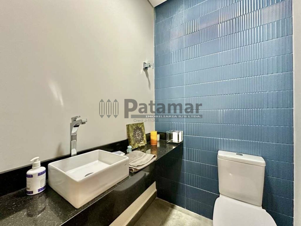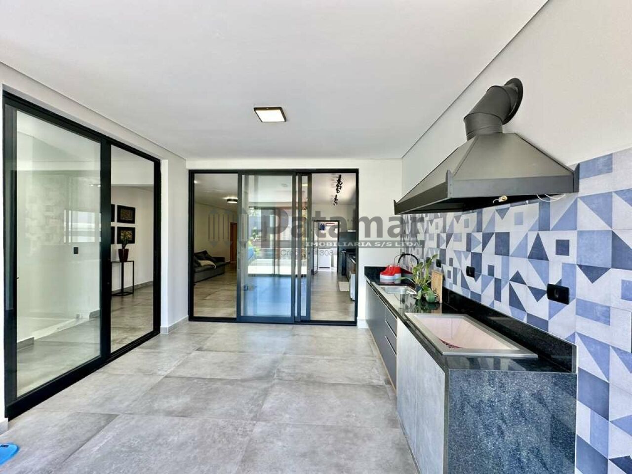 Varanda com churrasqueira, coifa, bancada com pia inox e gabinete. Banheiro de apoio.
