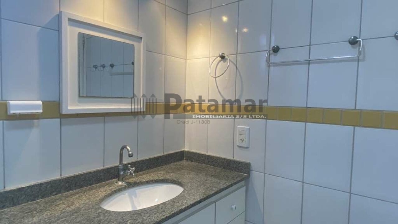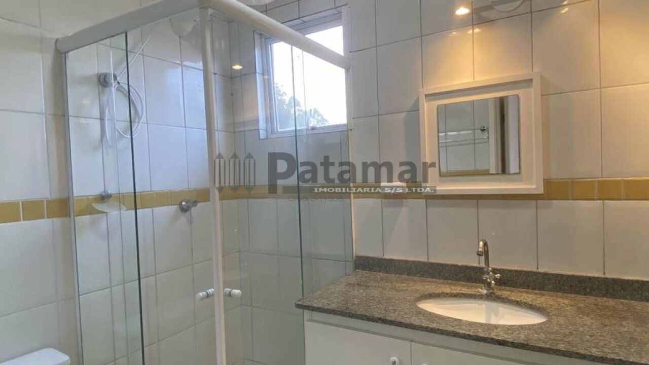 Banheiro social com box de vidro temperado, chuveiro elétrico e gabinete