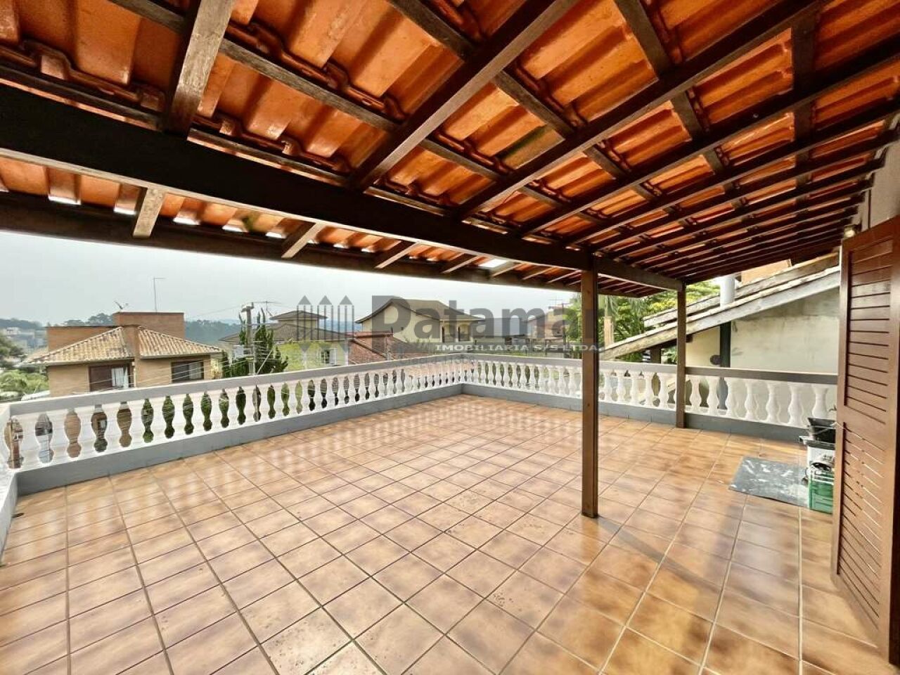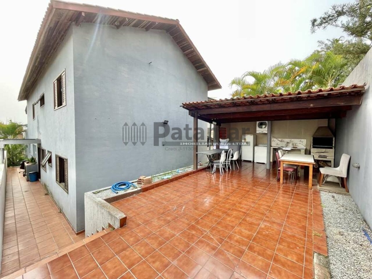Edícula com churrasqueira, bancada, cuba inox e um grande terraço solarium.