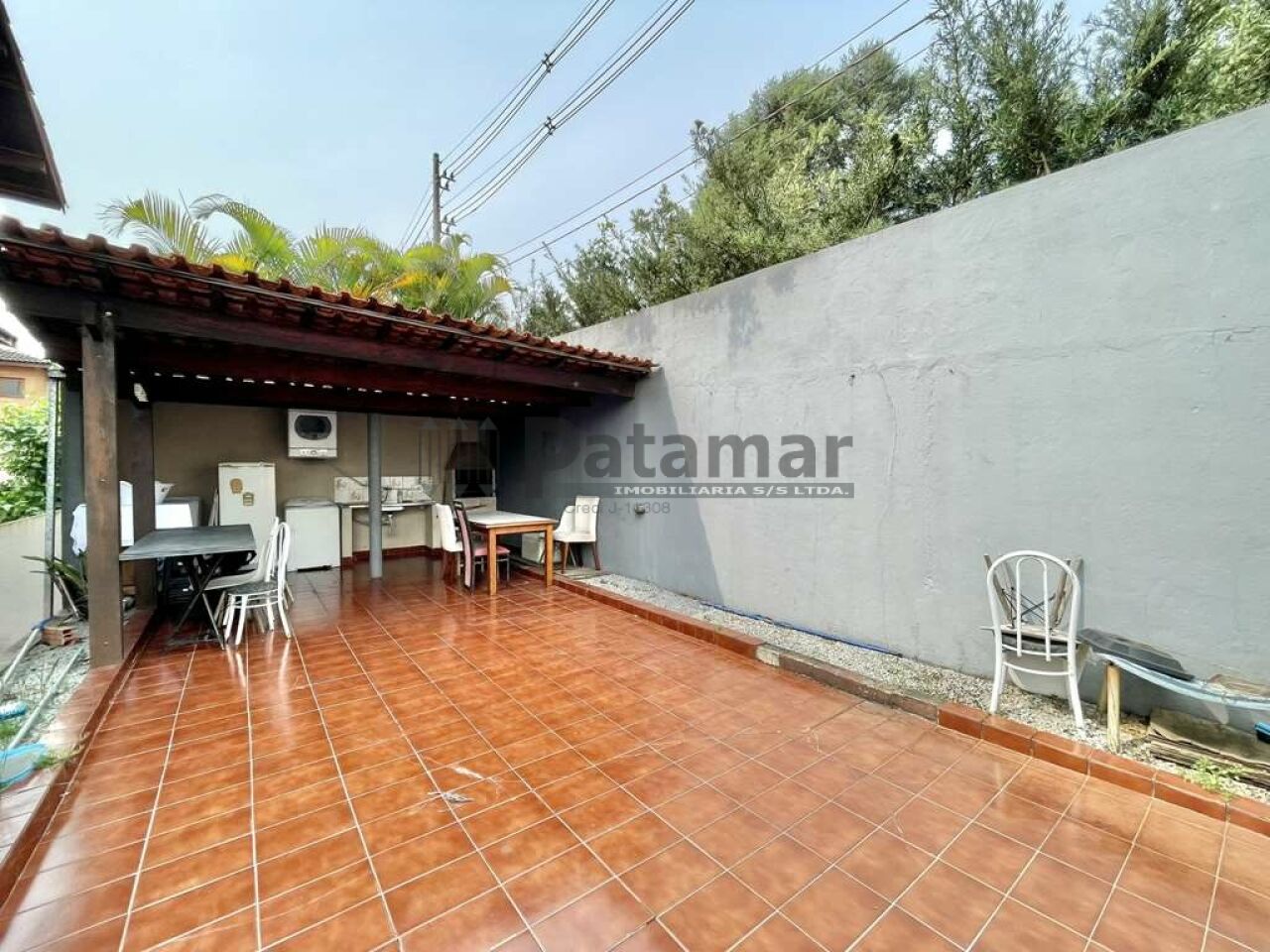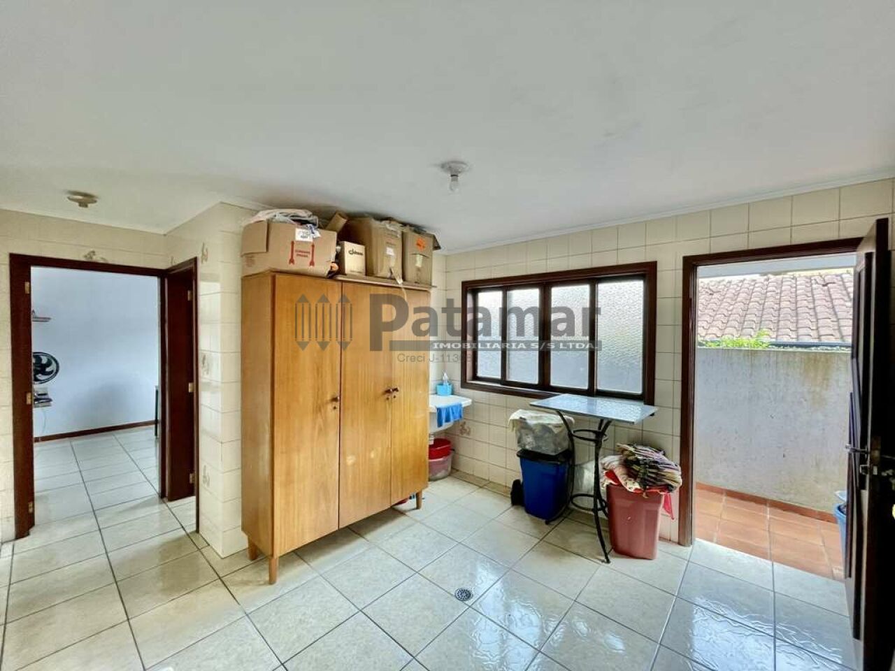 Área de serviço aberta ensolarada e lavanderia fechada com tanque.