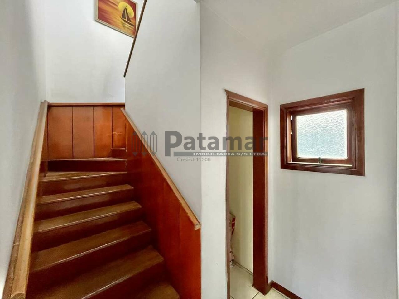 Escada de alvenaria revestida em madeira com corrimão de madeira.