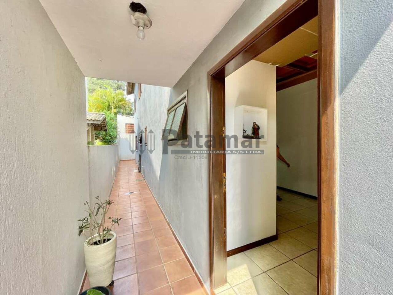 Entrada social por uma porta de madeira.