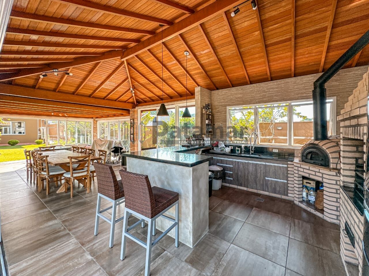 Salão de festas gourmet com churrasqueira e forno de pizza.