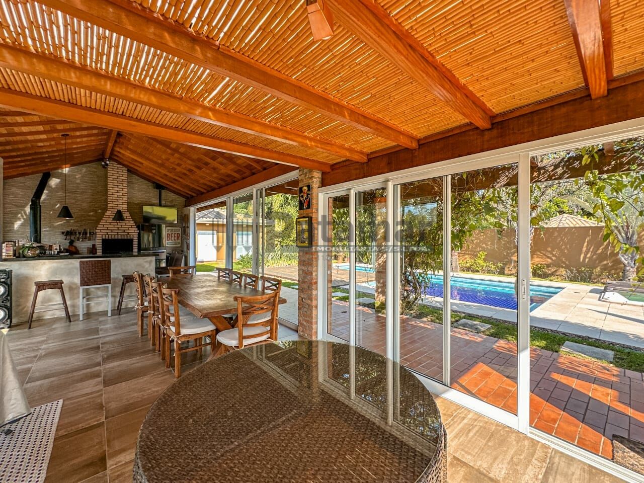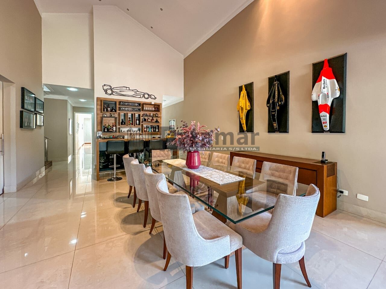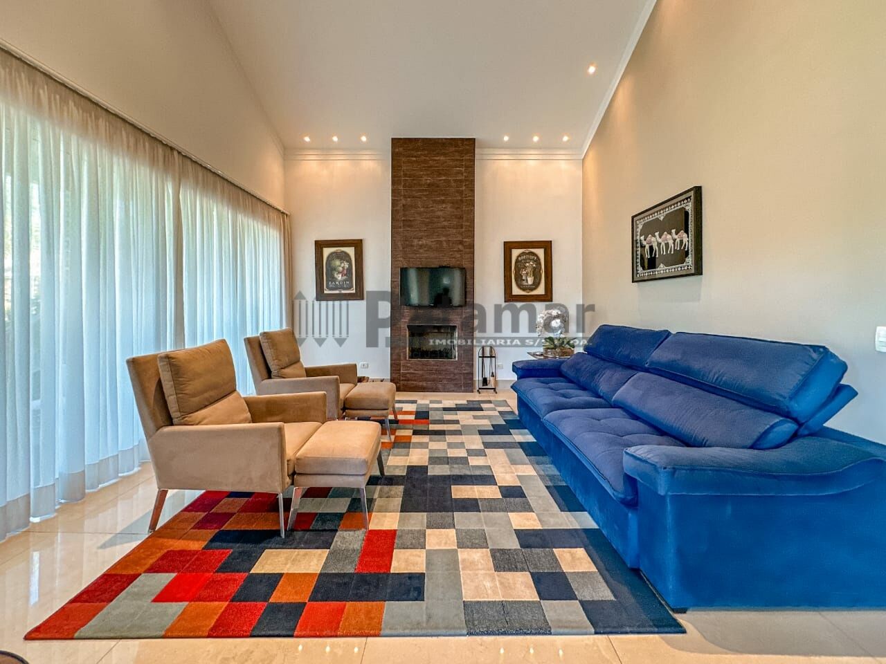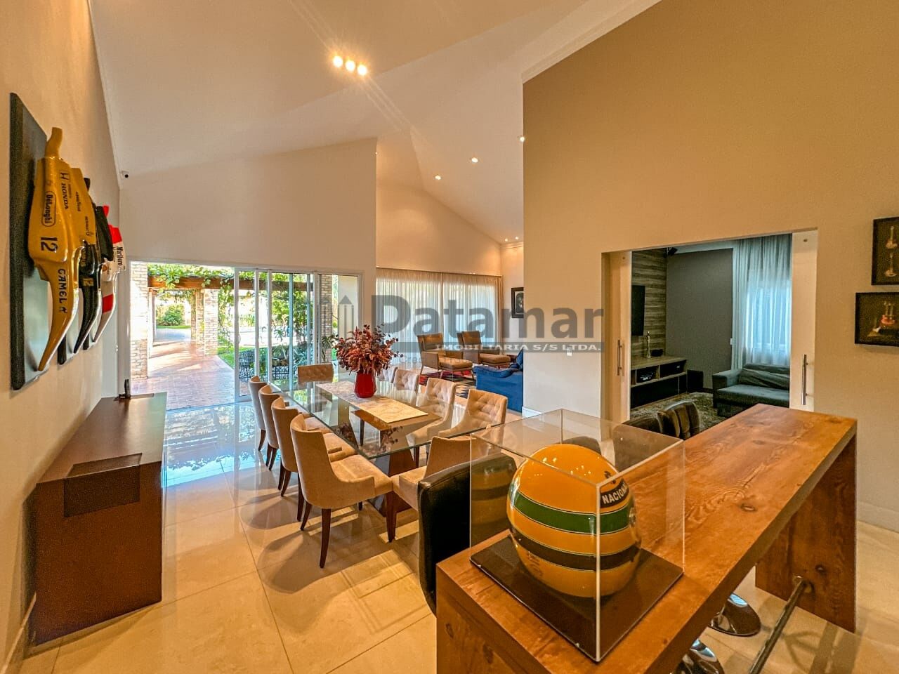 Sala de estar com lareira, sala de jantar, sala de cinema/tv.