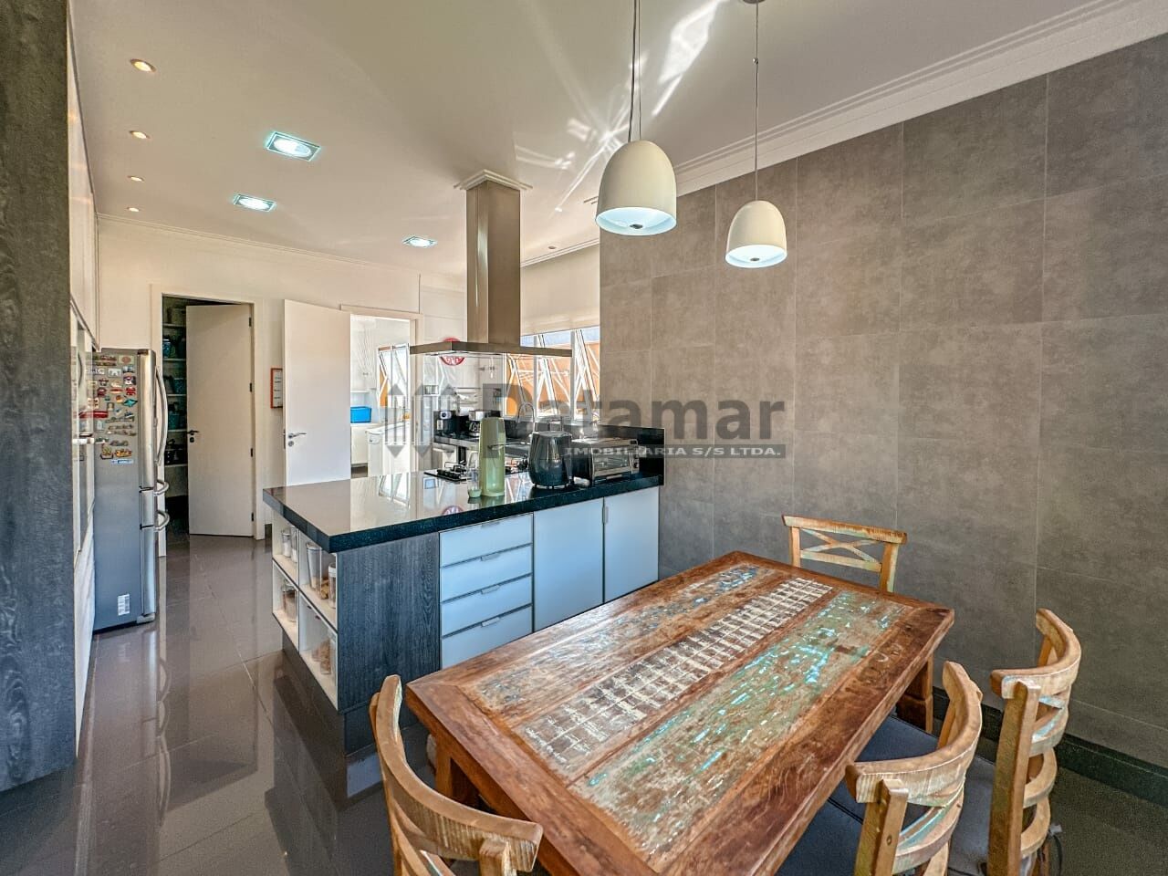 Cozinha com balcão e despensa. Fogão e coifa.