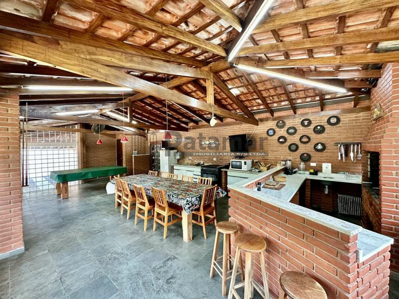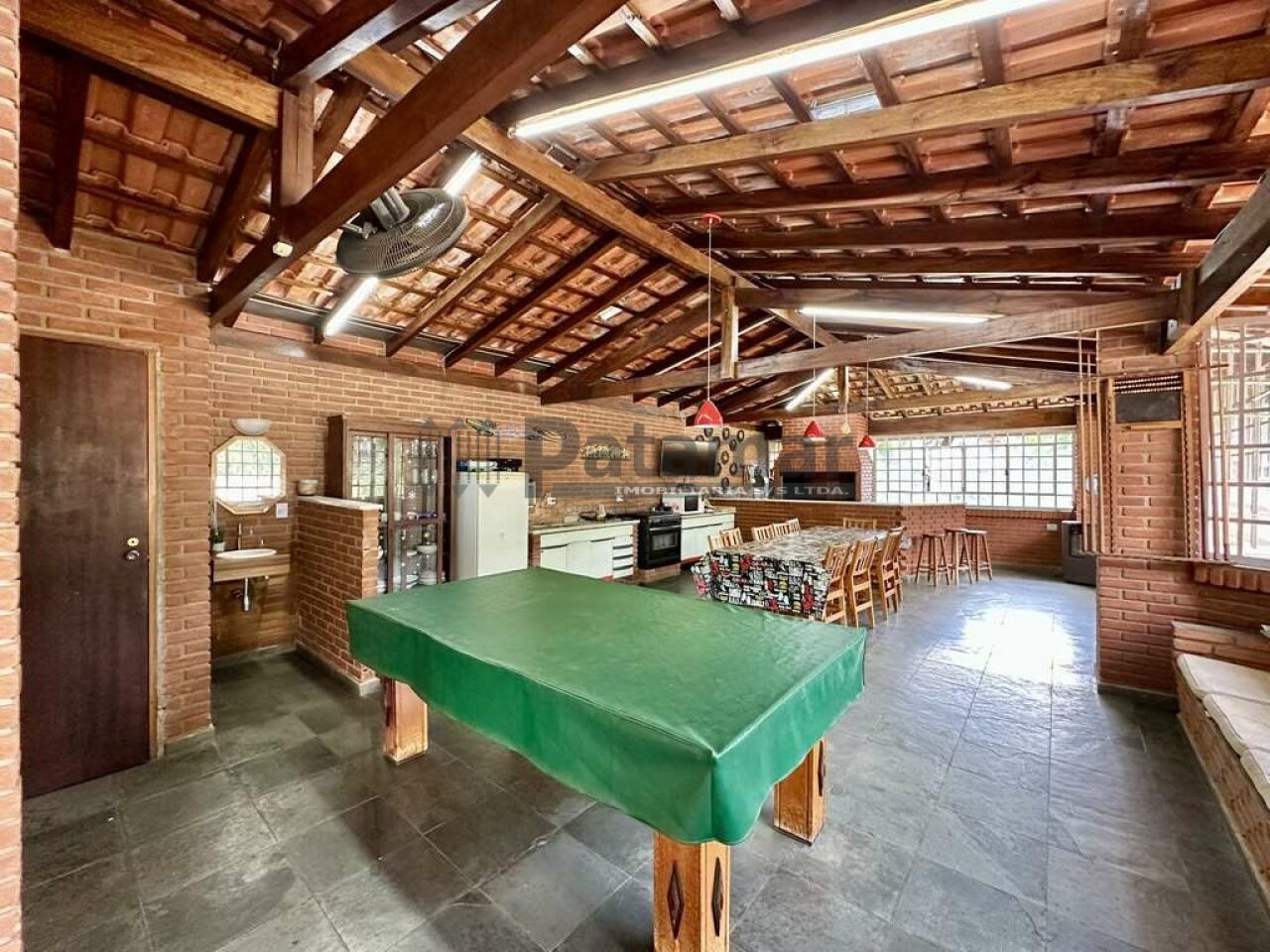 Espaço para jogos com mesa de bilhar, mesa com 12 cadeiras, TV, geladeira, guarda louças, banco de alvenaria para 5 assentos.