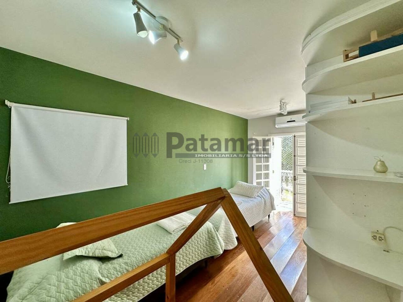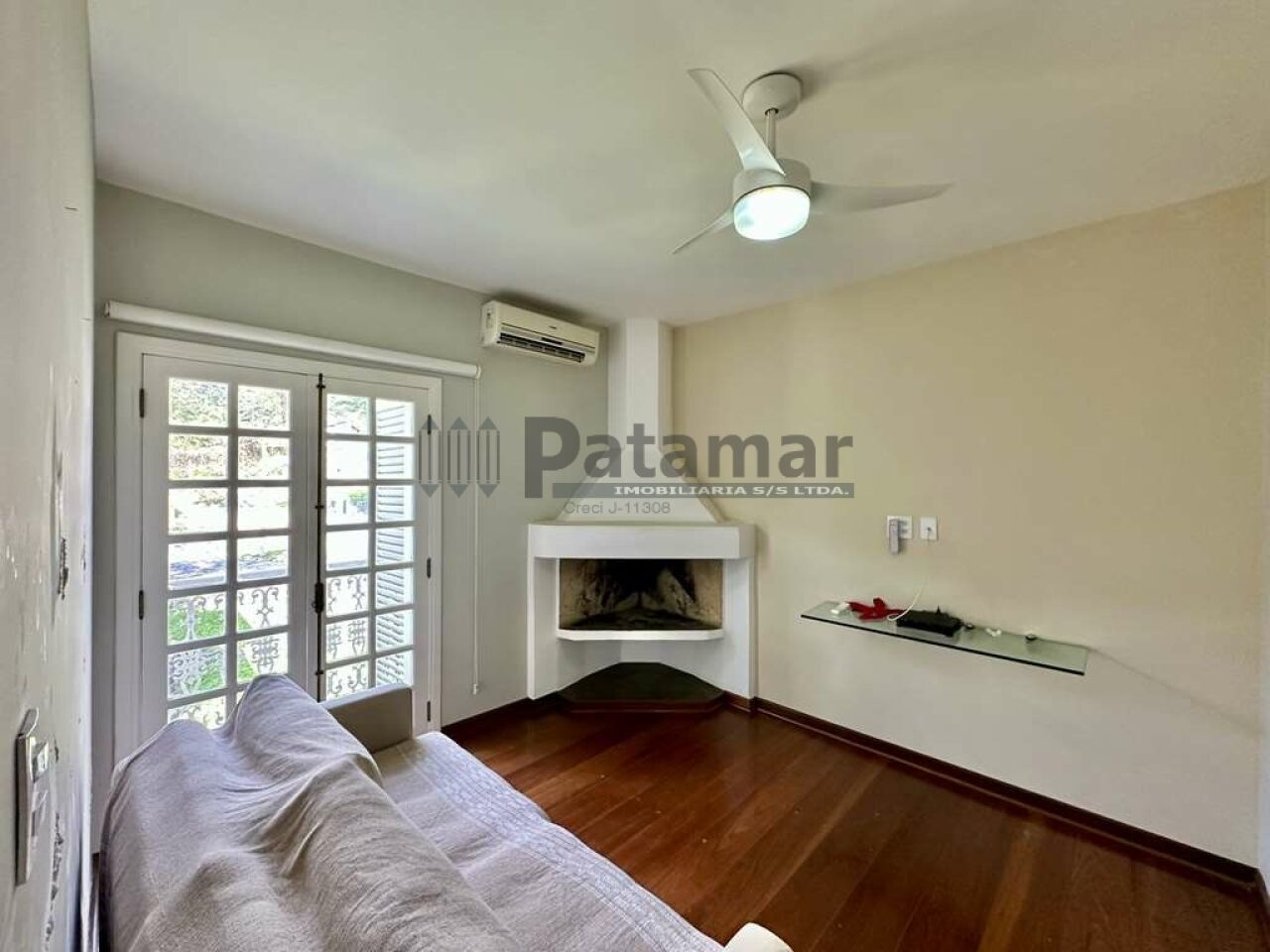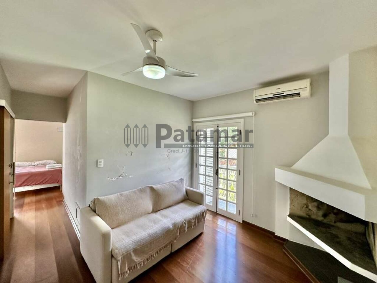 3 suítes no piso superior, com terraços, ar-condicionado, sendo a master com sala íntima e lareira. 2 com armários, 1 com ventilador.