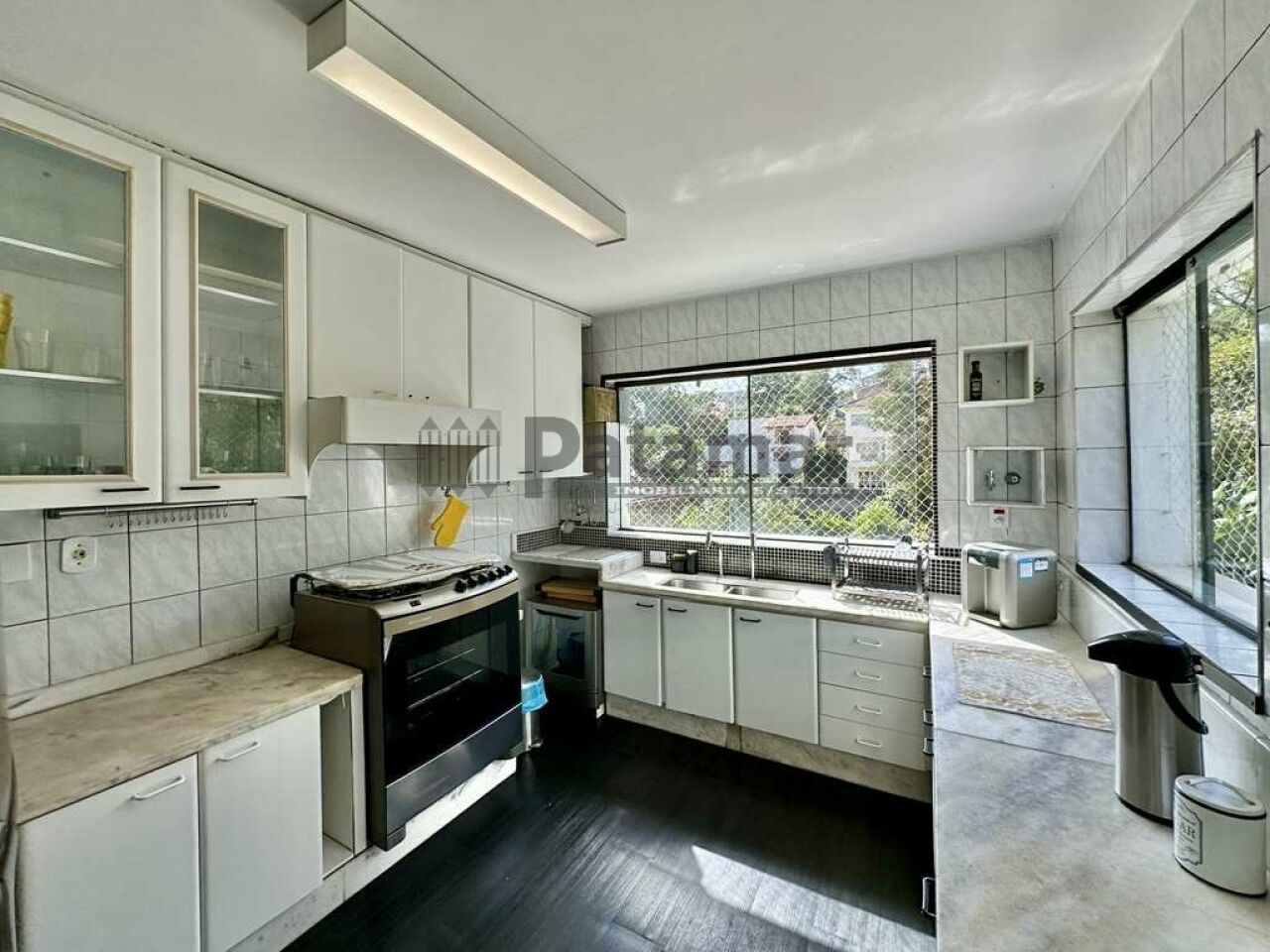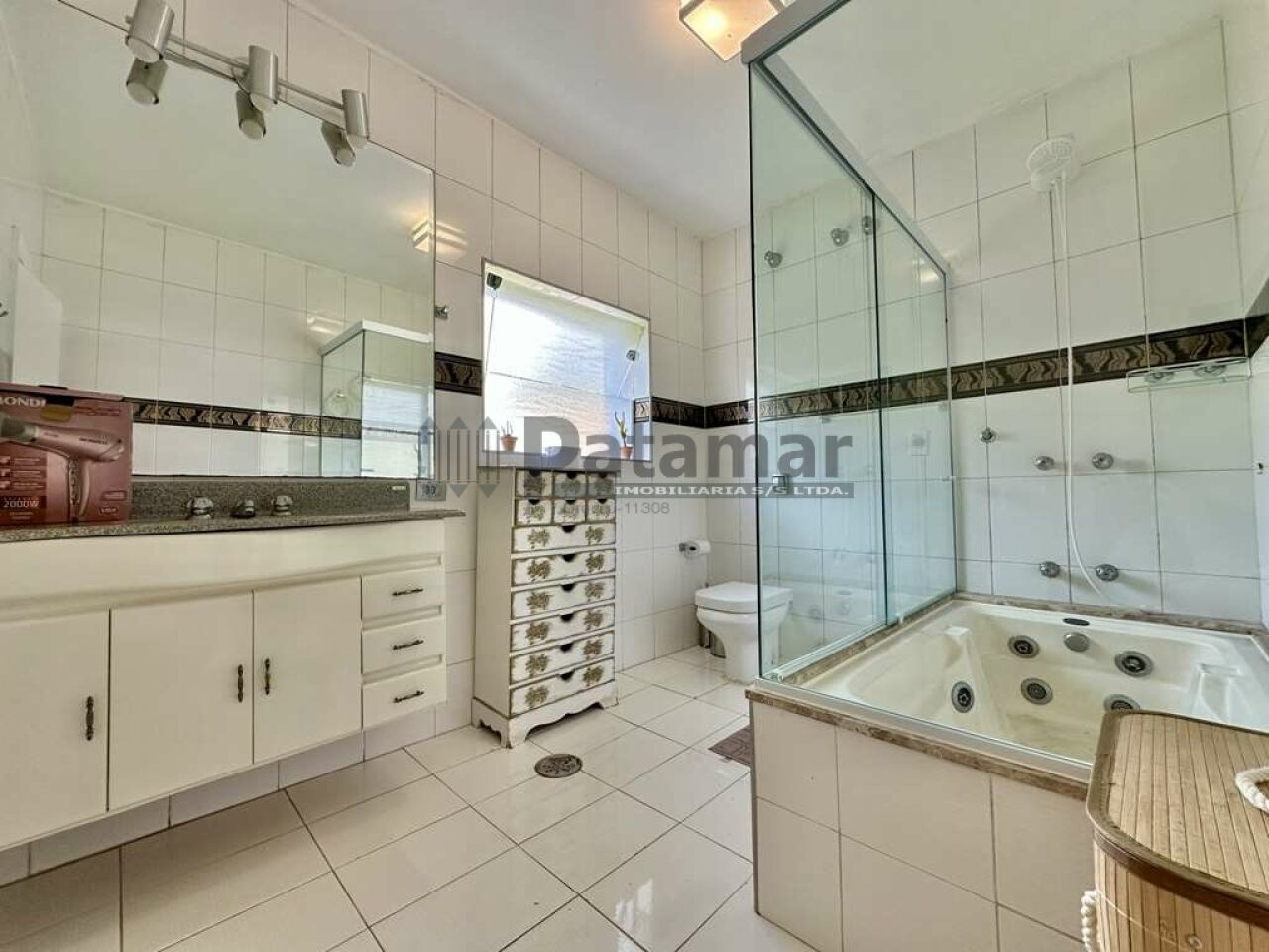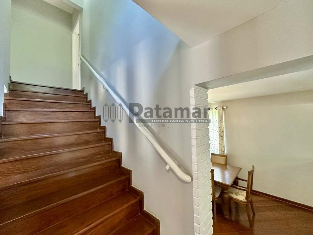 3 suítes no piso superior, com terraços, ar-condicionado, sendo a master com sala íntima e lareira. 2 com armários, 1 com ventilador.