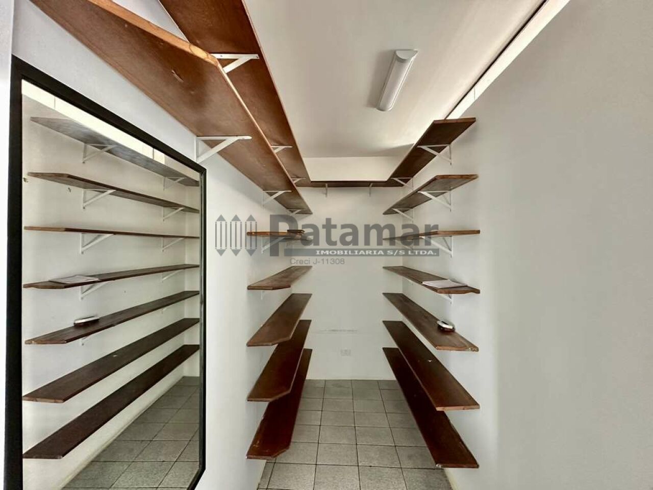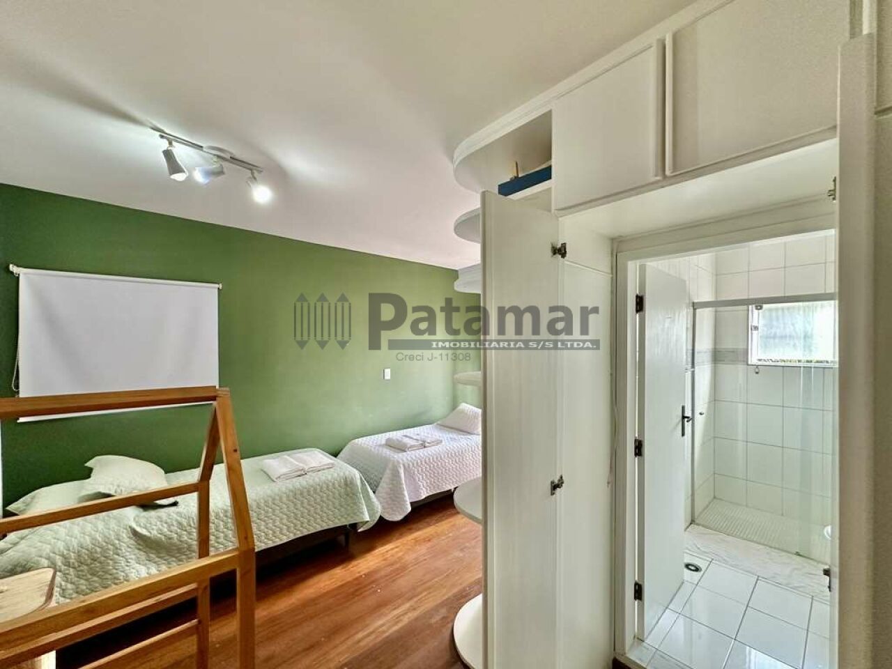 1 suíte no piso inferior com porta de correr, armário e ar-condicionado.