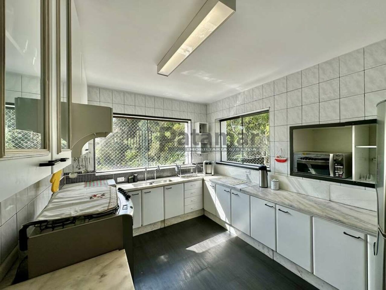 Cozinha com armários planejados, despensa e gabinetes, tampos e bancadas em mármore, 2 cubas inox.