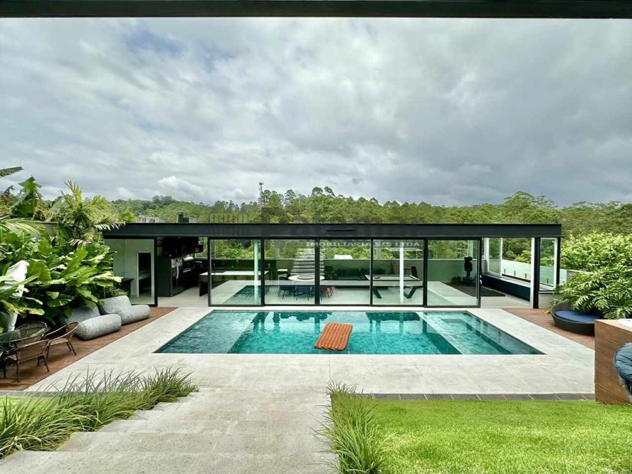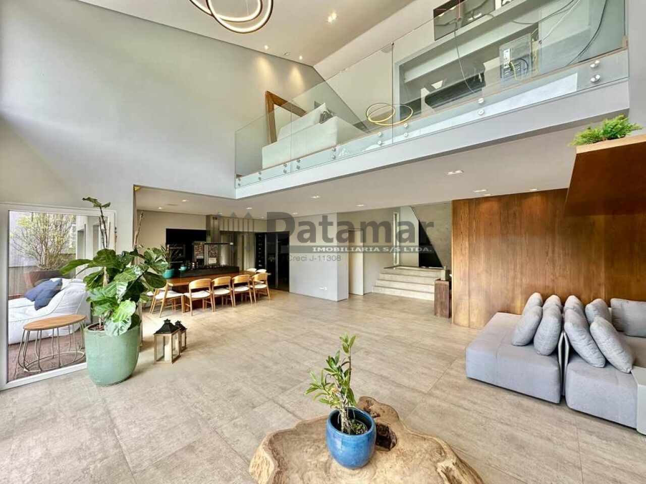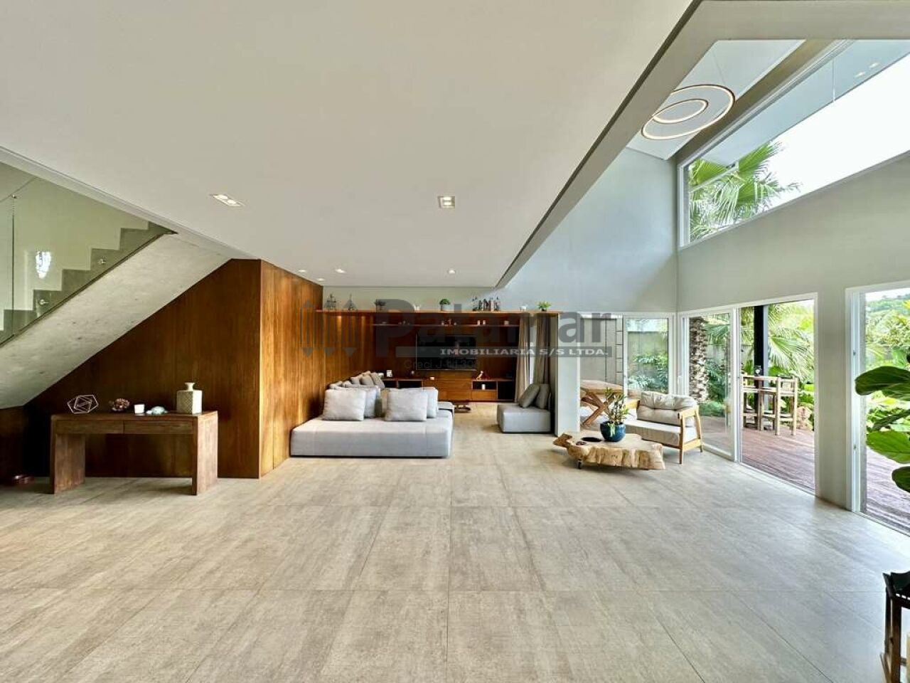 Living para 5 ambientes voltados para varanda, piscina, jardim e anexo gourmet.