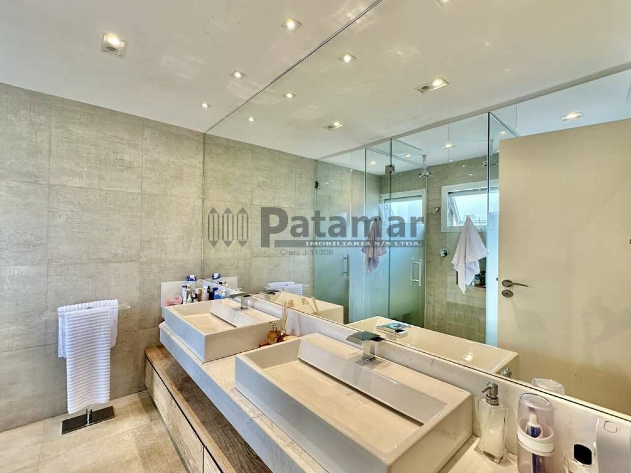 Banheiros com espelhos, gabinetes com gavetões, bancada, box de vidro até o teto, nichos e chuveiros de teto. Sendo a master com tampo em mármore, 2 cubas, 2 duchas de teto e 2 vasos separados.