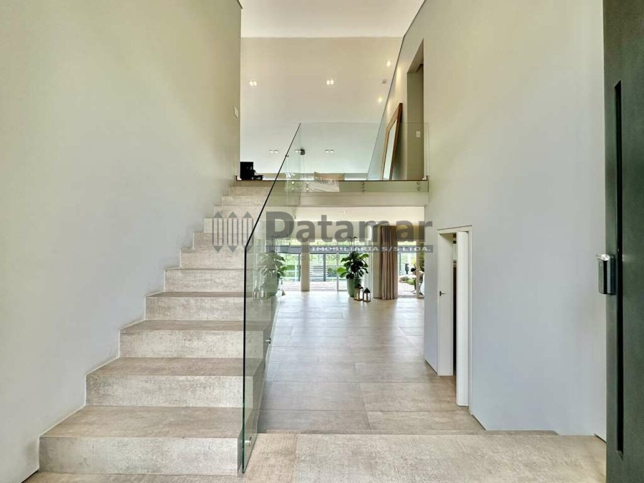 Hall de entrada social com pé direito alto, porta pivotante imponente e fechadura eletrônica Yale.