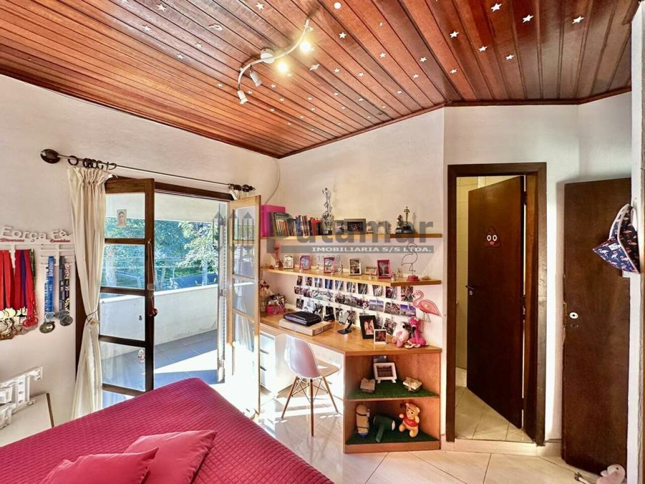 Portas e janelas em madeira e vidro, com venezianas nos quartos.