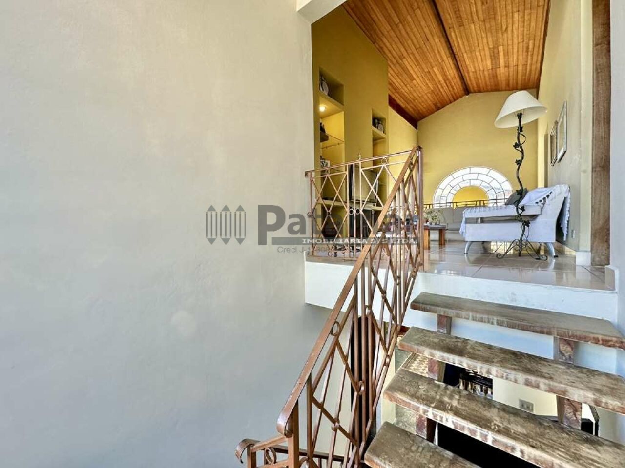 Escada de madeira com guarda corpo de ferro e um grande vitral.