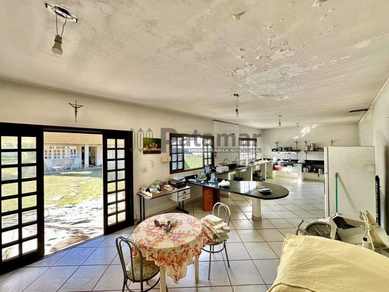 Foi usada como cozinha industrial, com grande bancada em granito, balcão em ?U?, 3 pias inox, prateleiras, fogão industrial, geladeira e freezer.