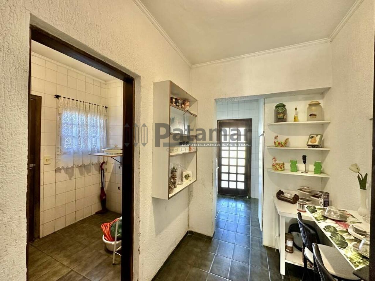 Área de serviço aberta ensolarada e lavanderia com tanque.