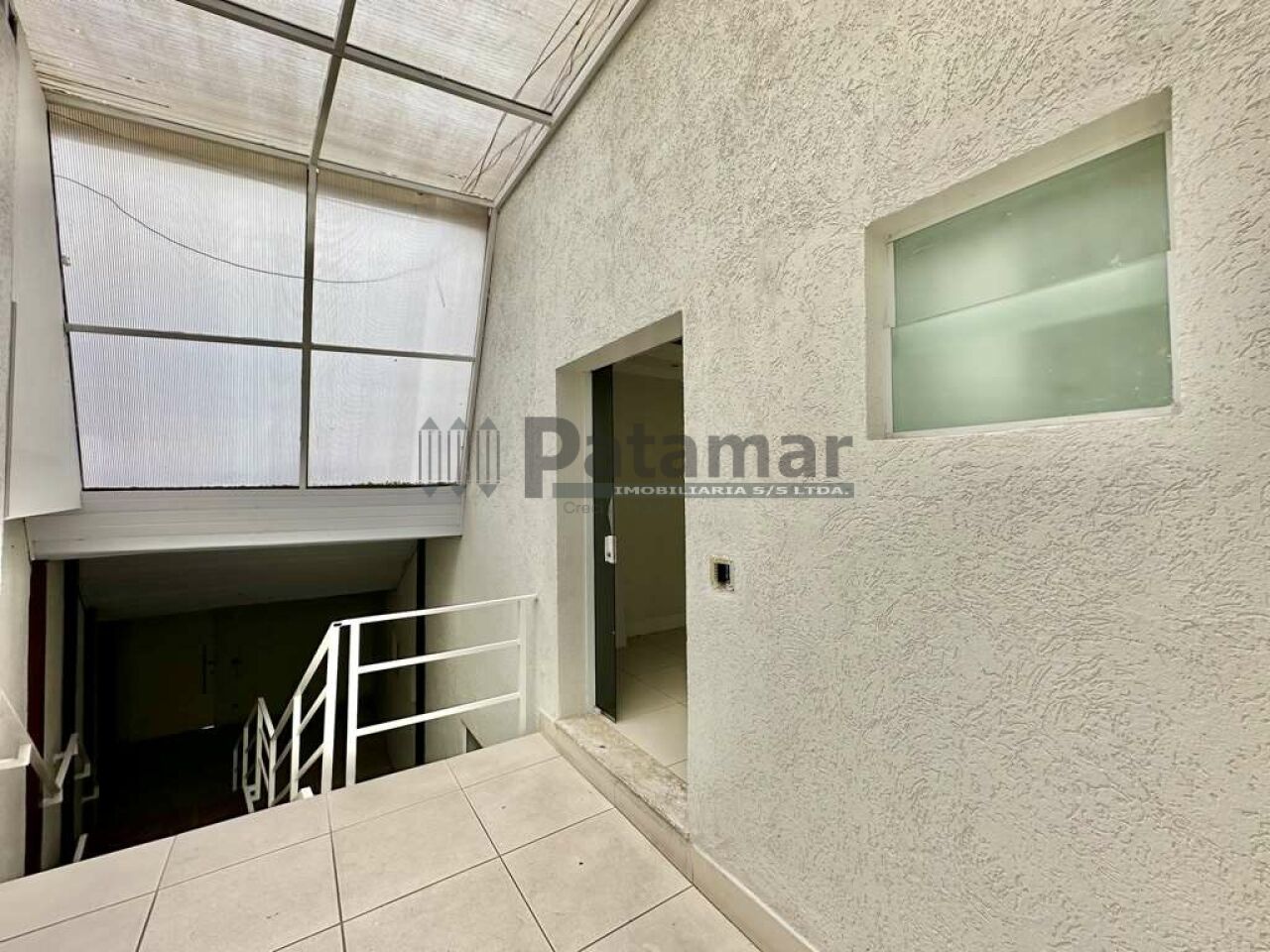 Hall da escada com porta de vidro e acesso ao piso superior.