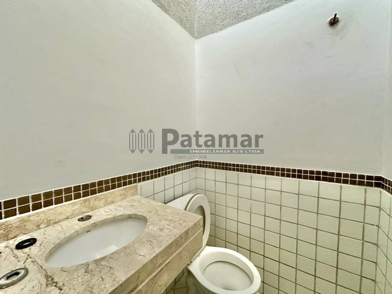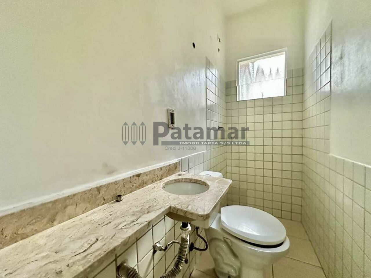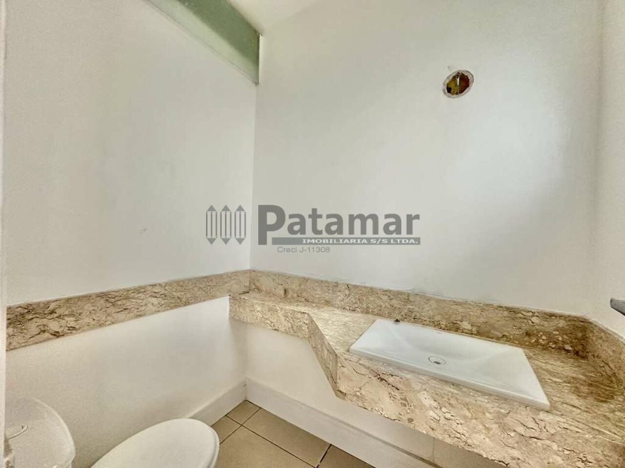 Lavabo com tampo em mármore e piso em porcelanato.