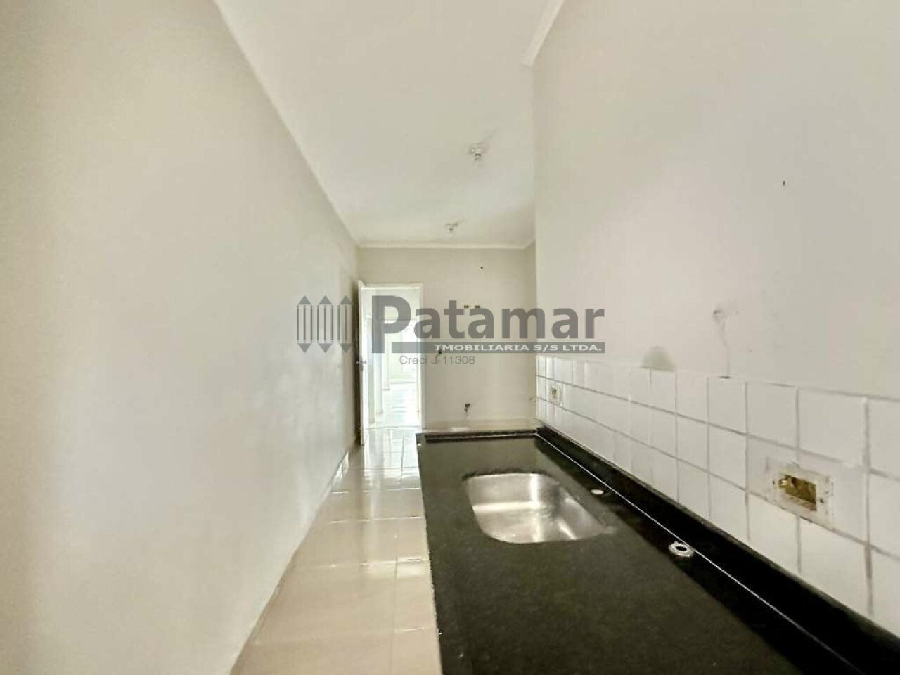 Copa/cozinha com pia inox, voltada para um quintal coberto e fechado.