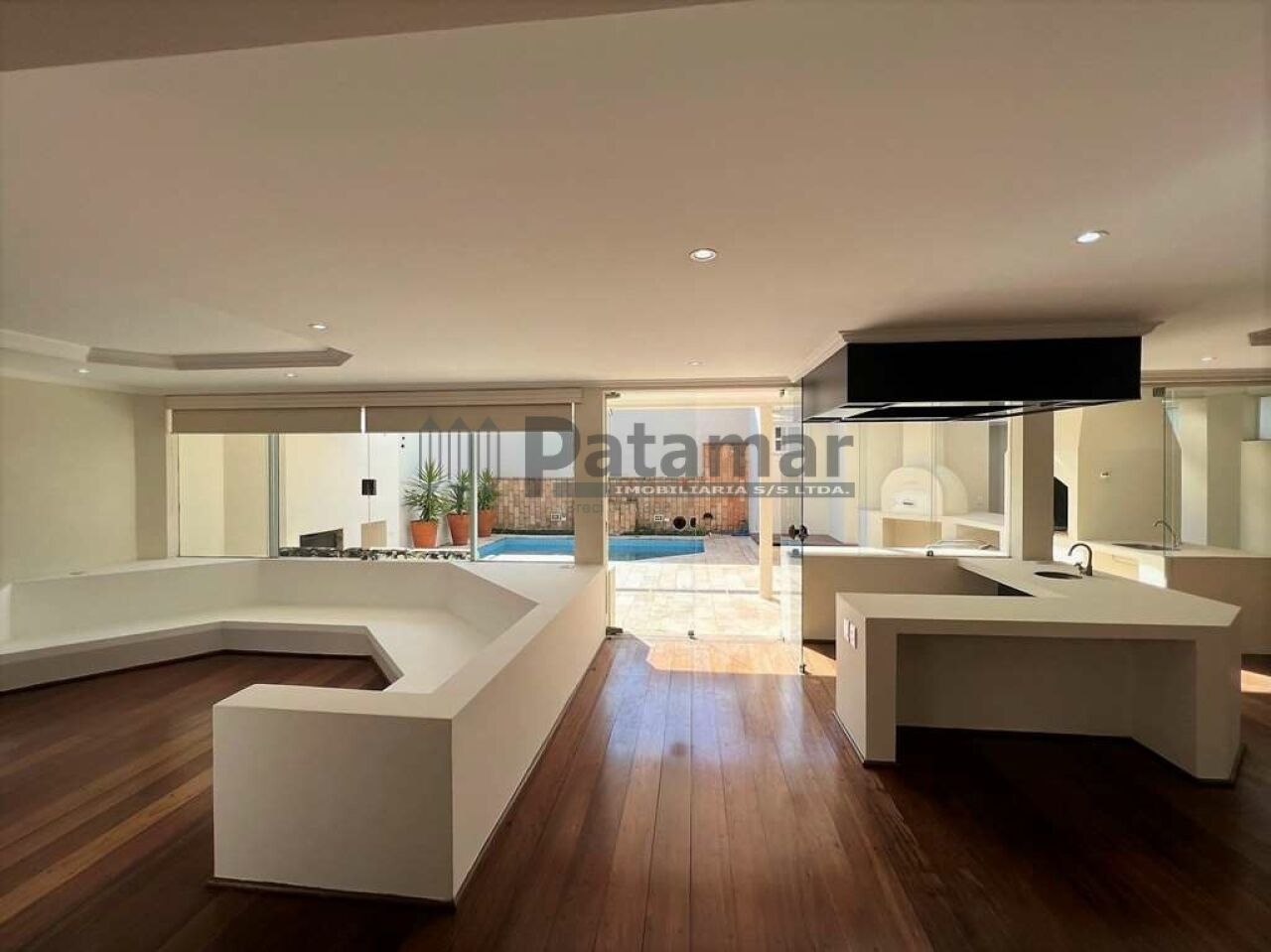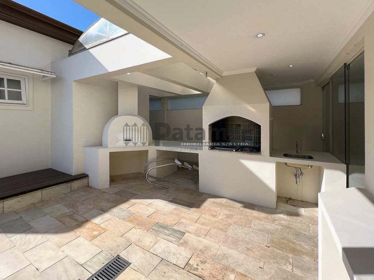 Varanda social com lareira, integrada ao gourmet com churrasqueira e forno de pizza.